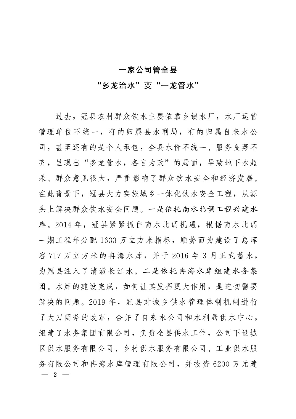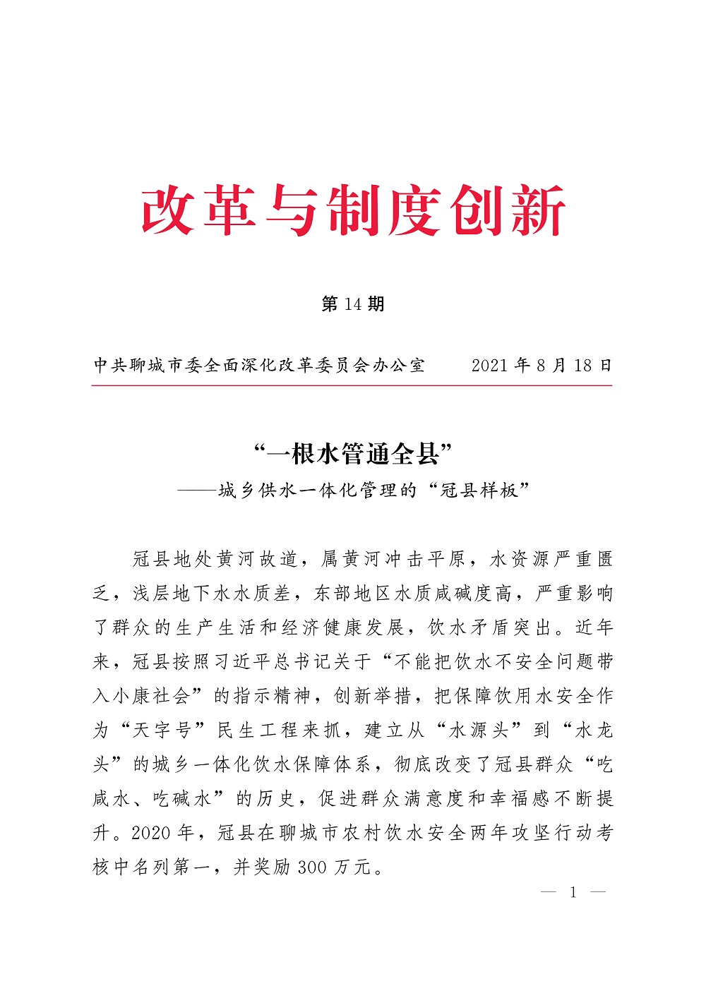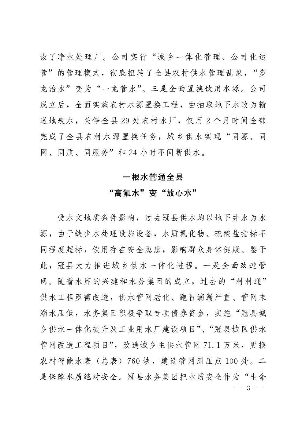 “一根水管通全县”—城乡供水一体化管理的“冠县样板”