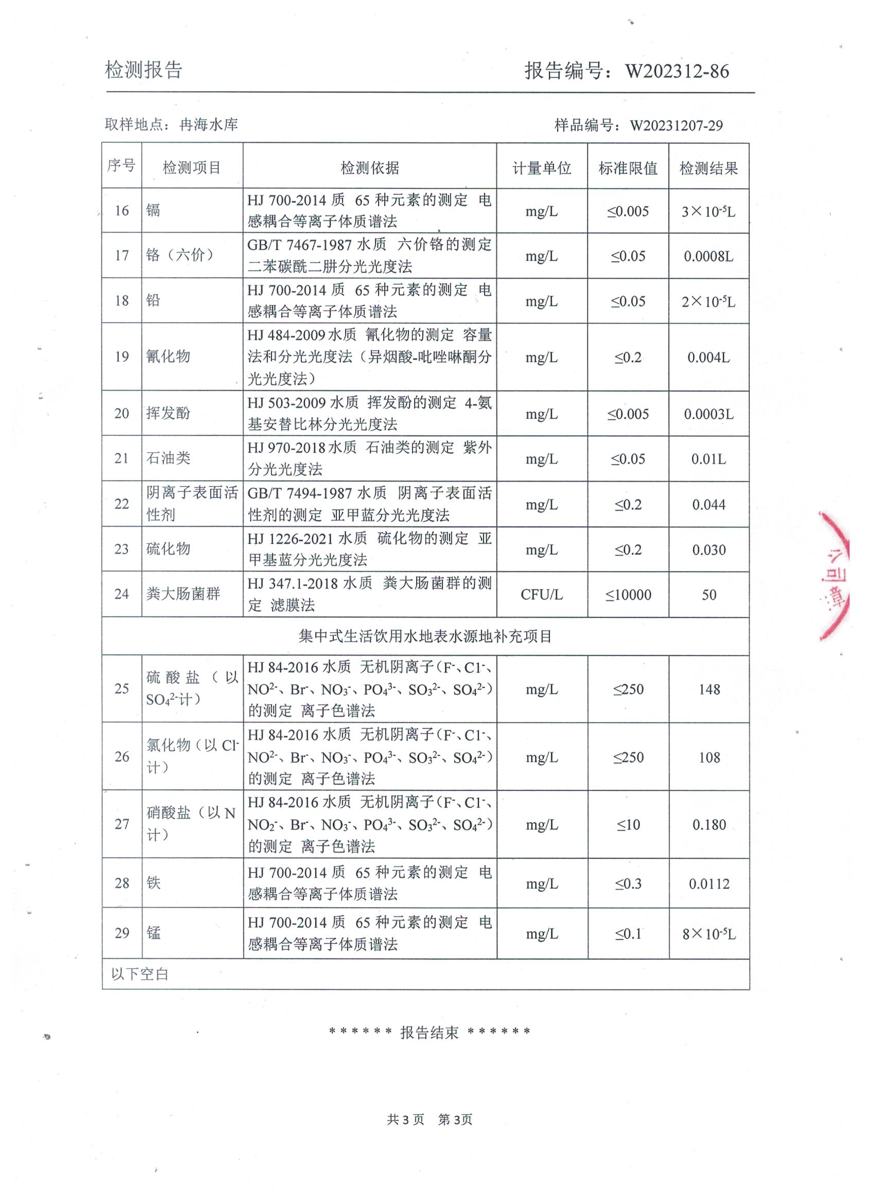 冠县自来水水质信息