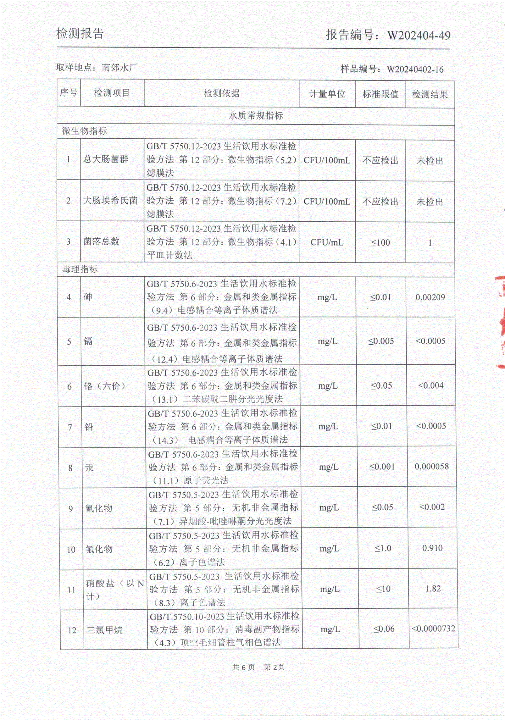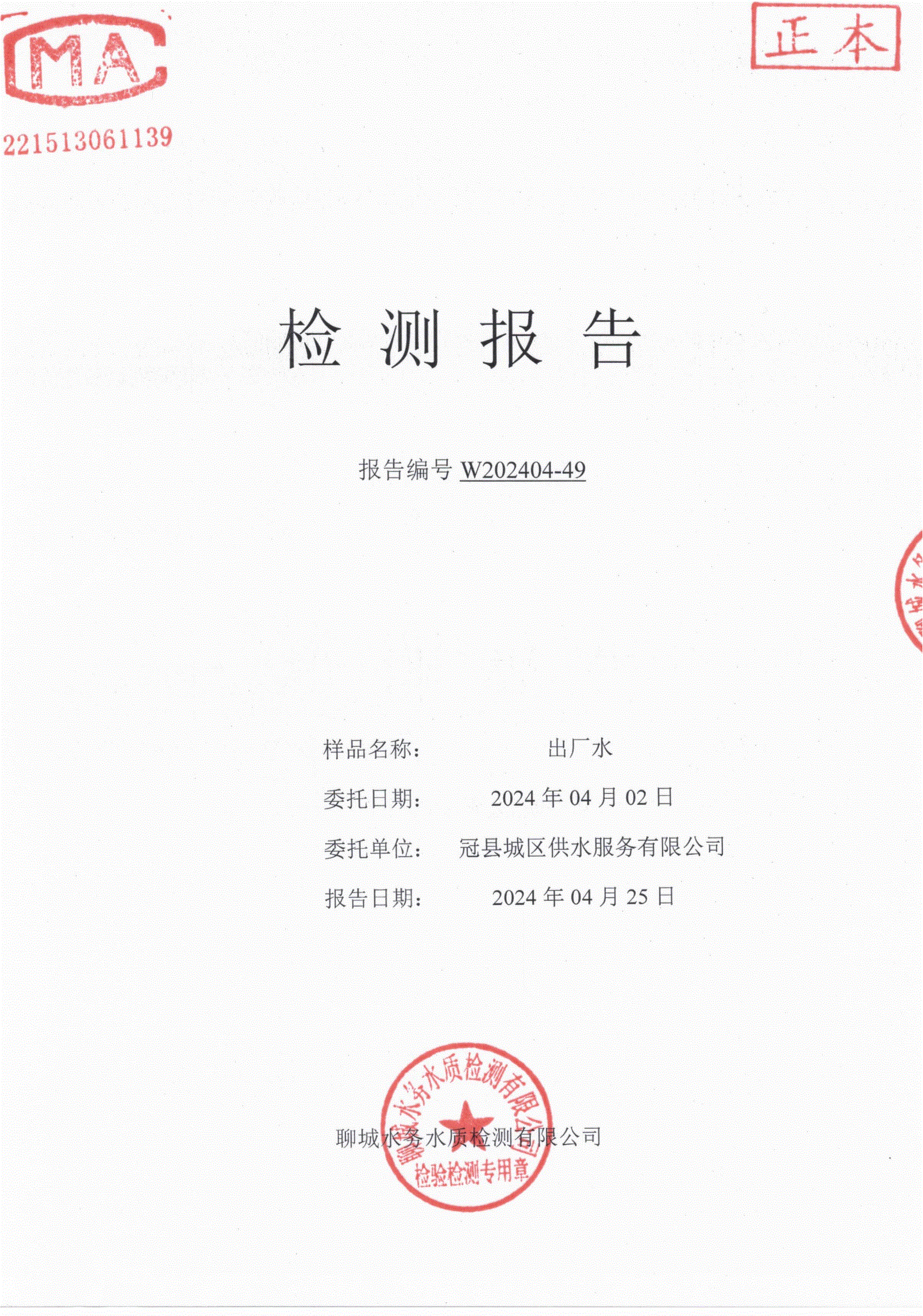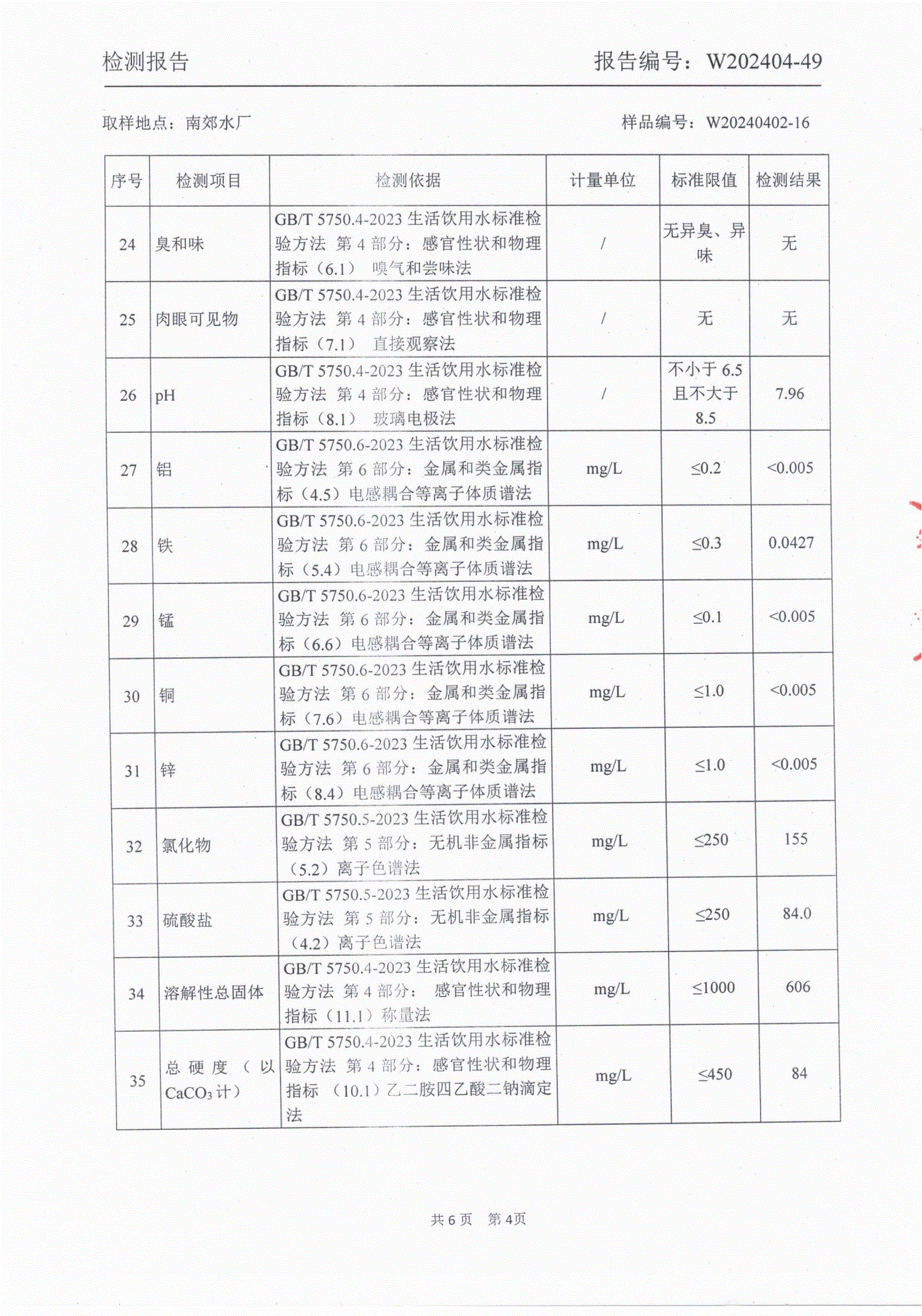 2024年4月城区出厂水水质检测报告
