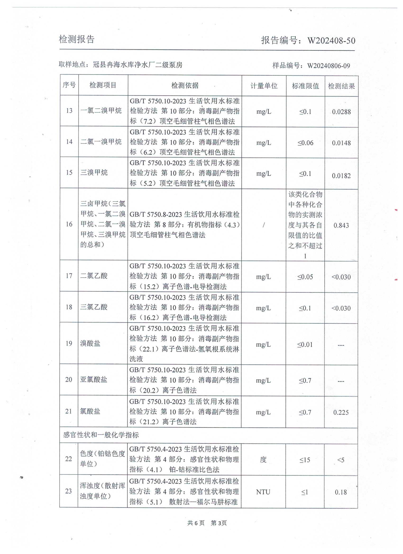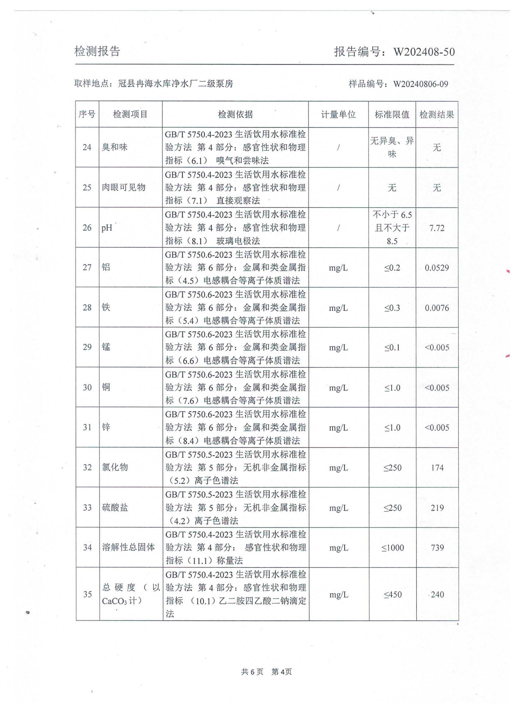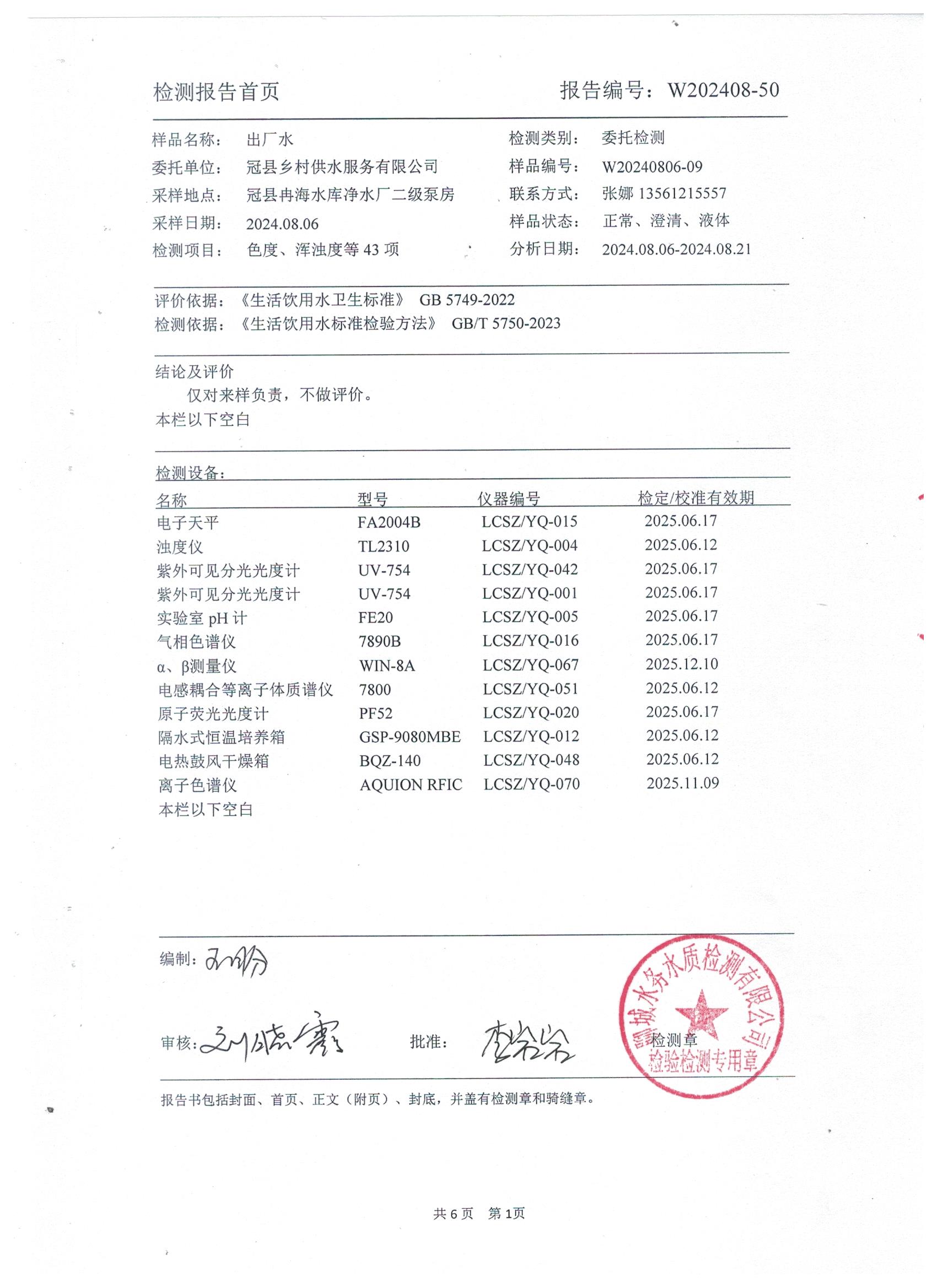 2024年8月出厂水水质检测报告