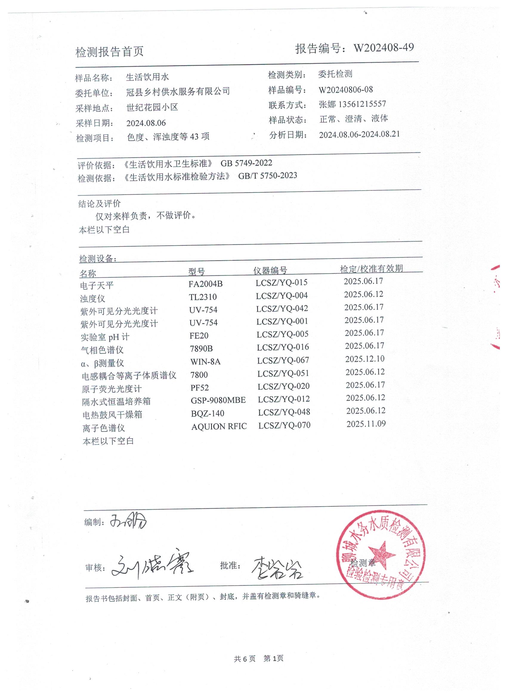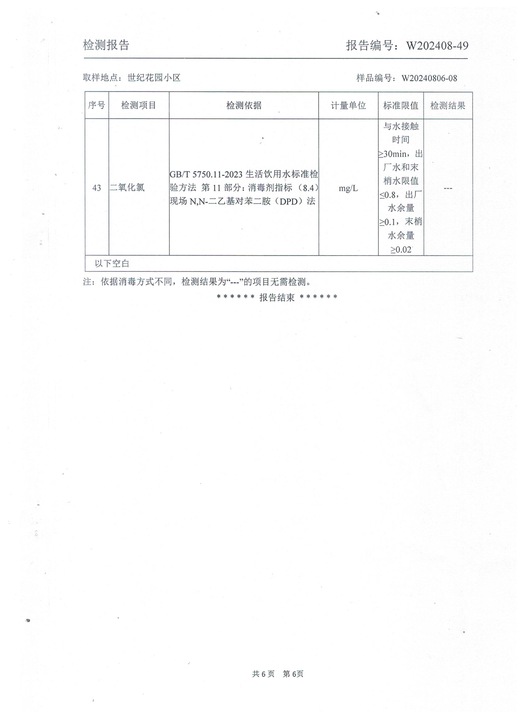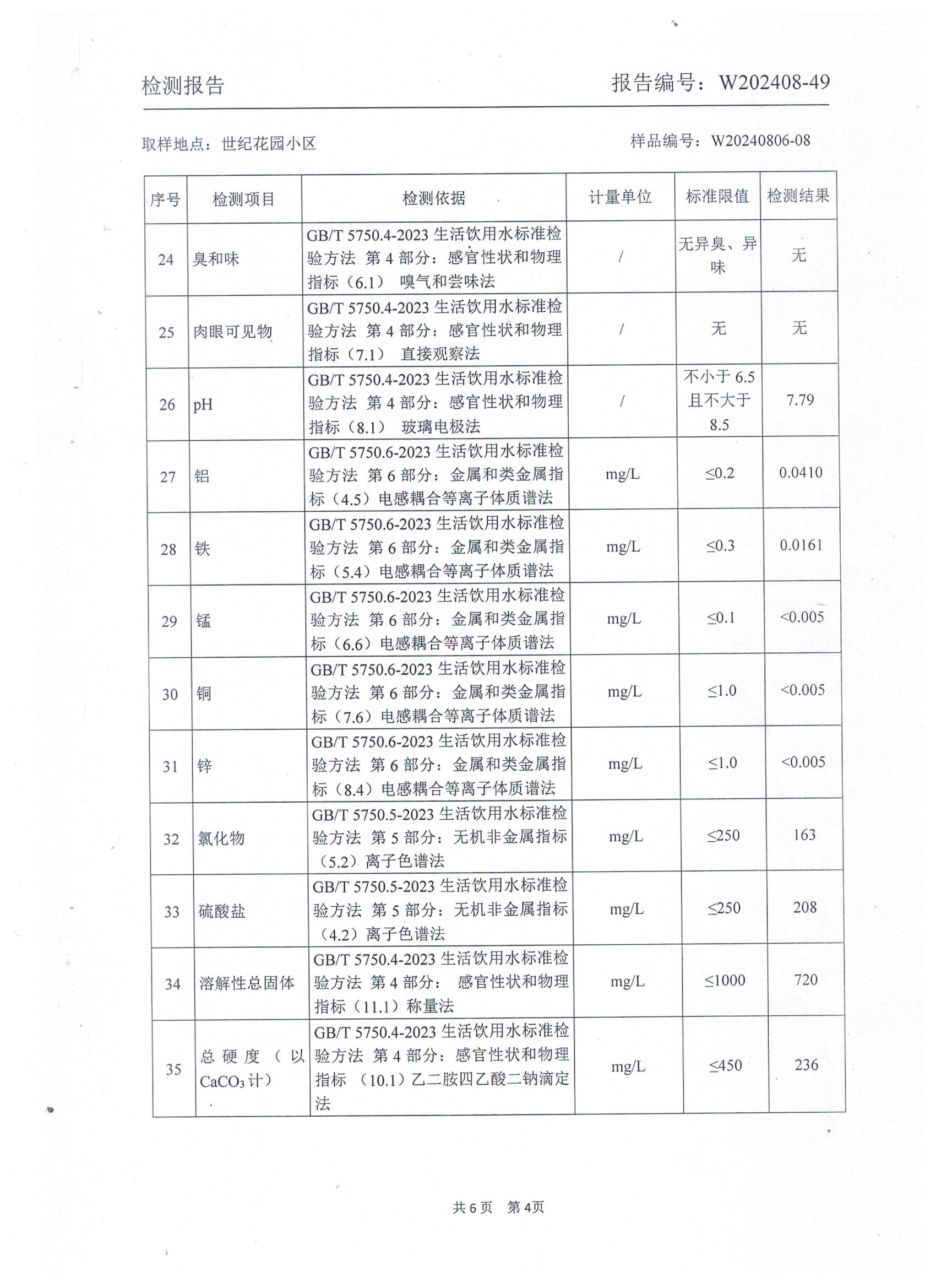 2024年8月管网水水质检测报告(世纪花园小区)