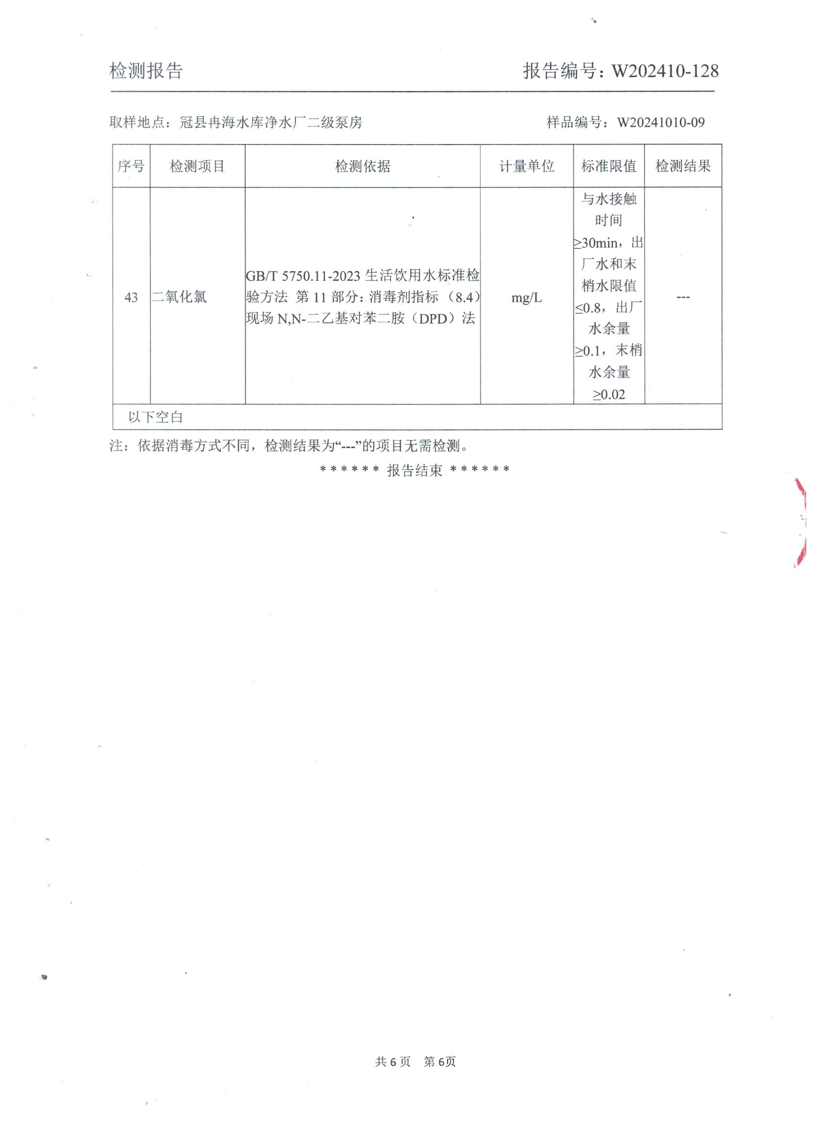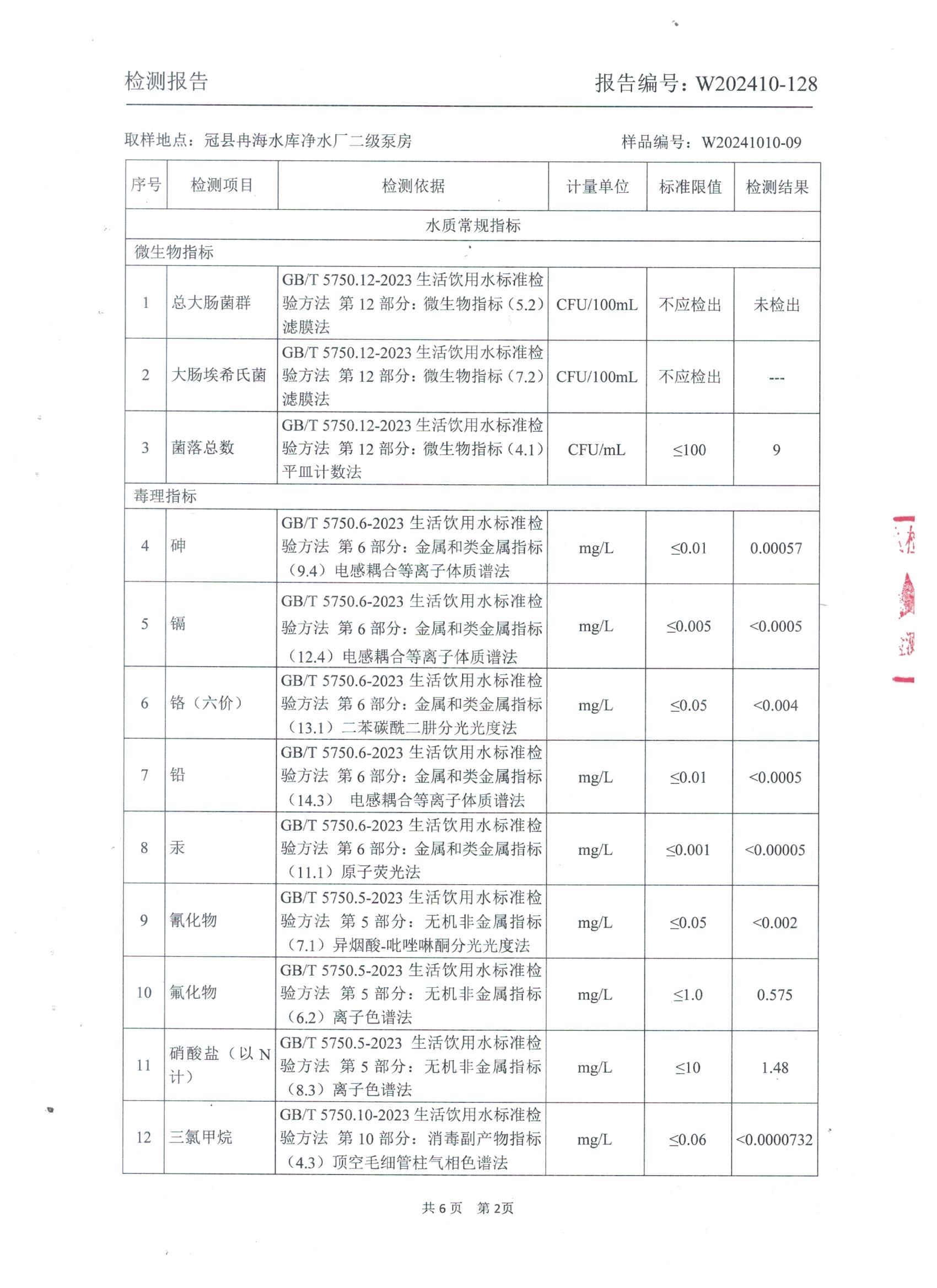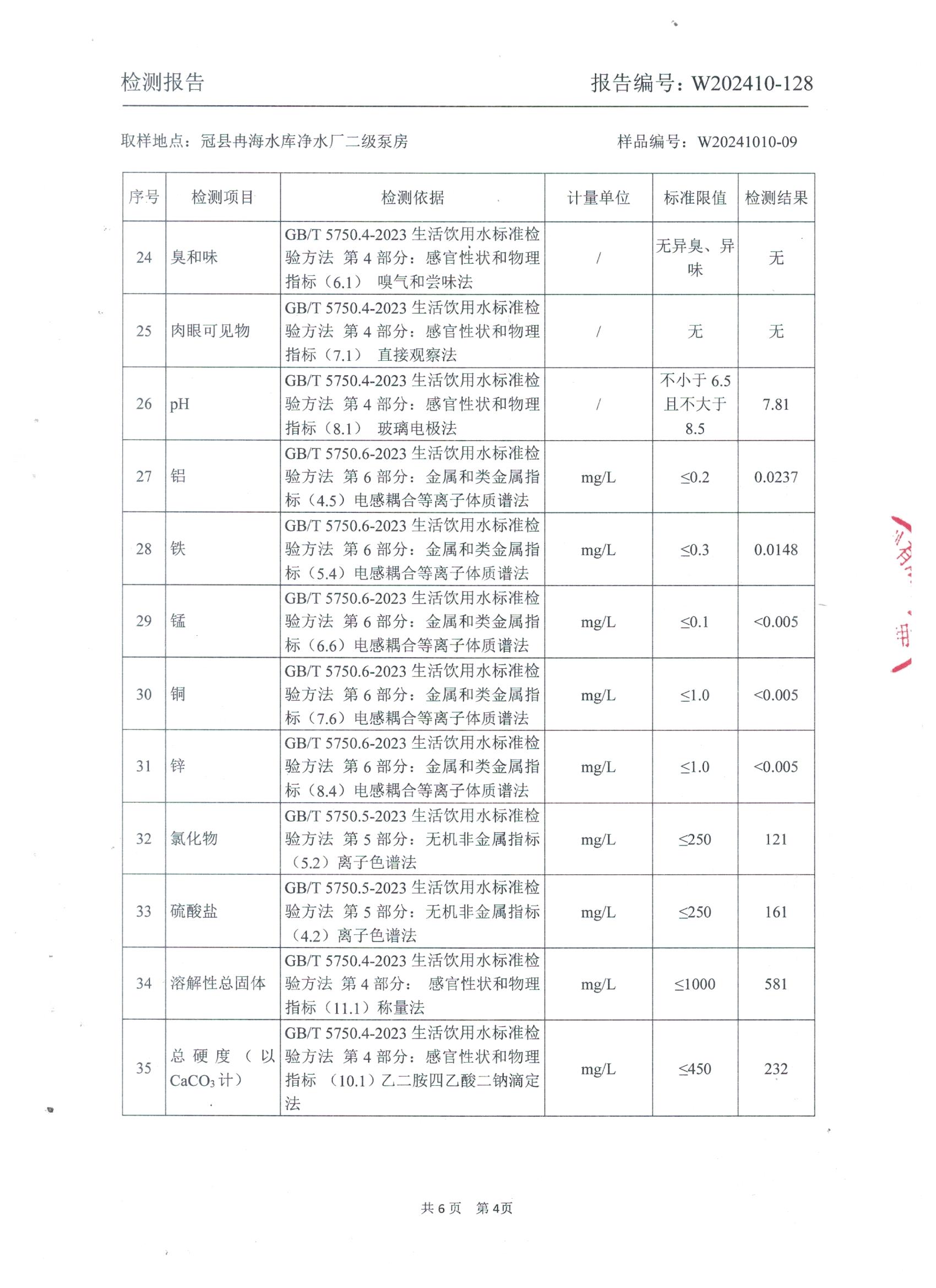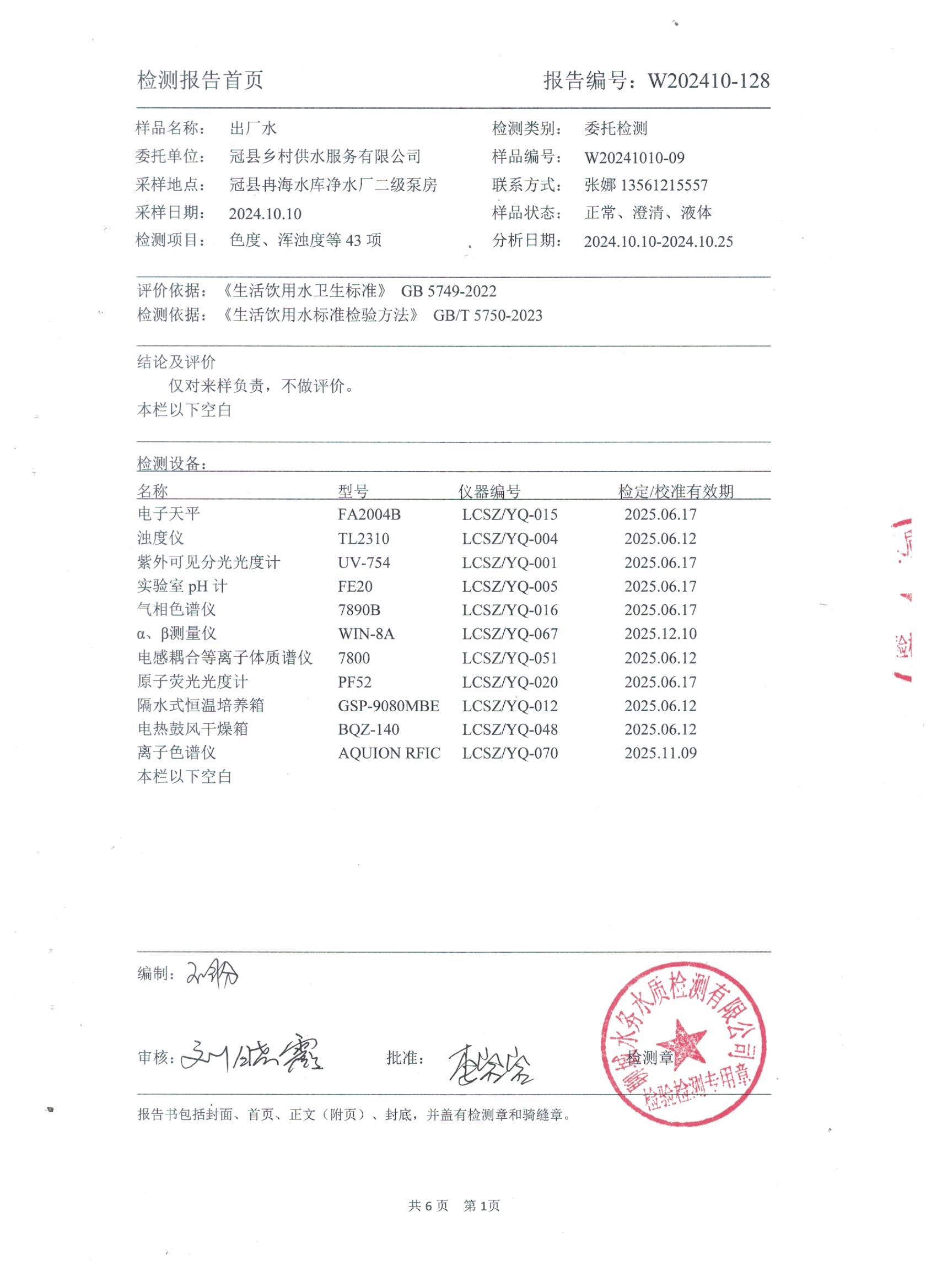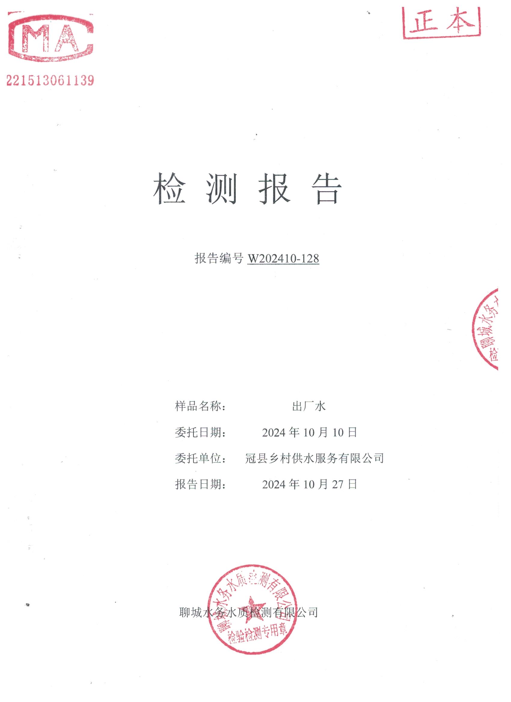 2024年10月出厂水水质检测报告