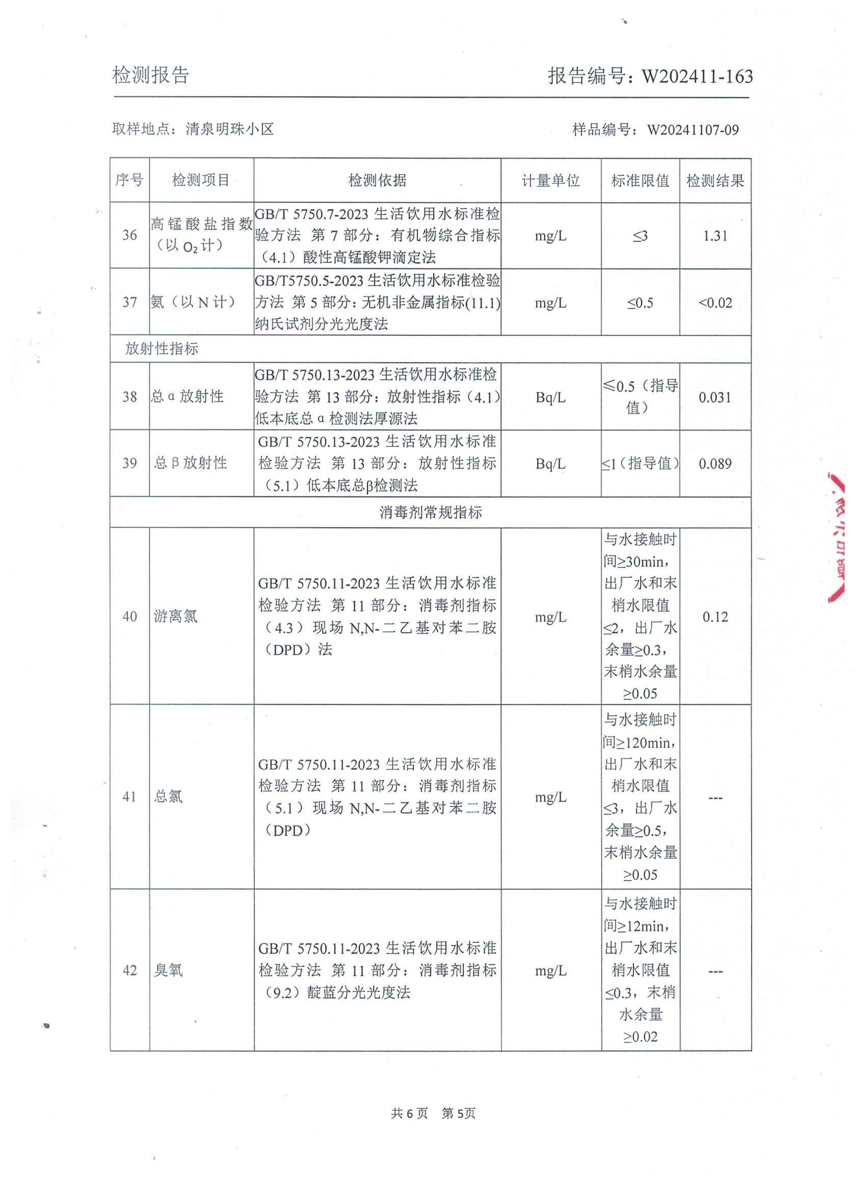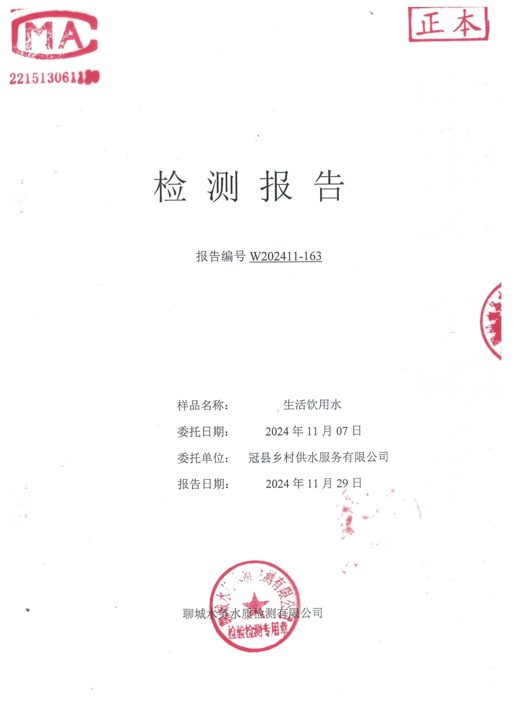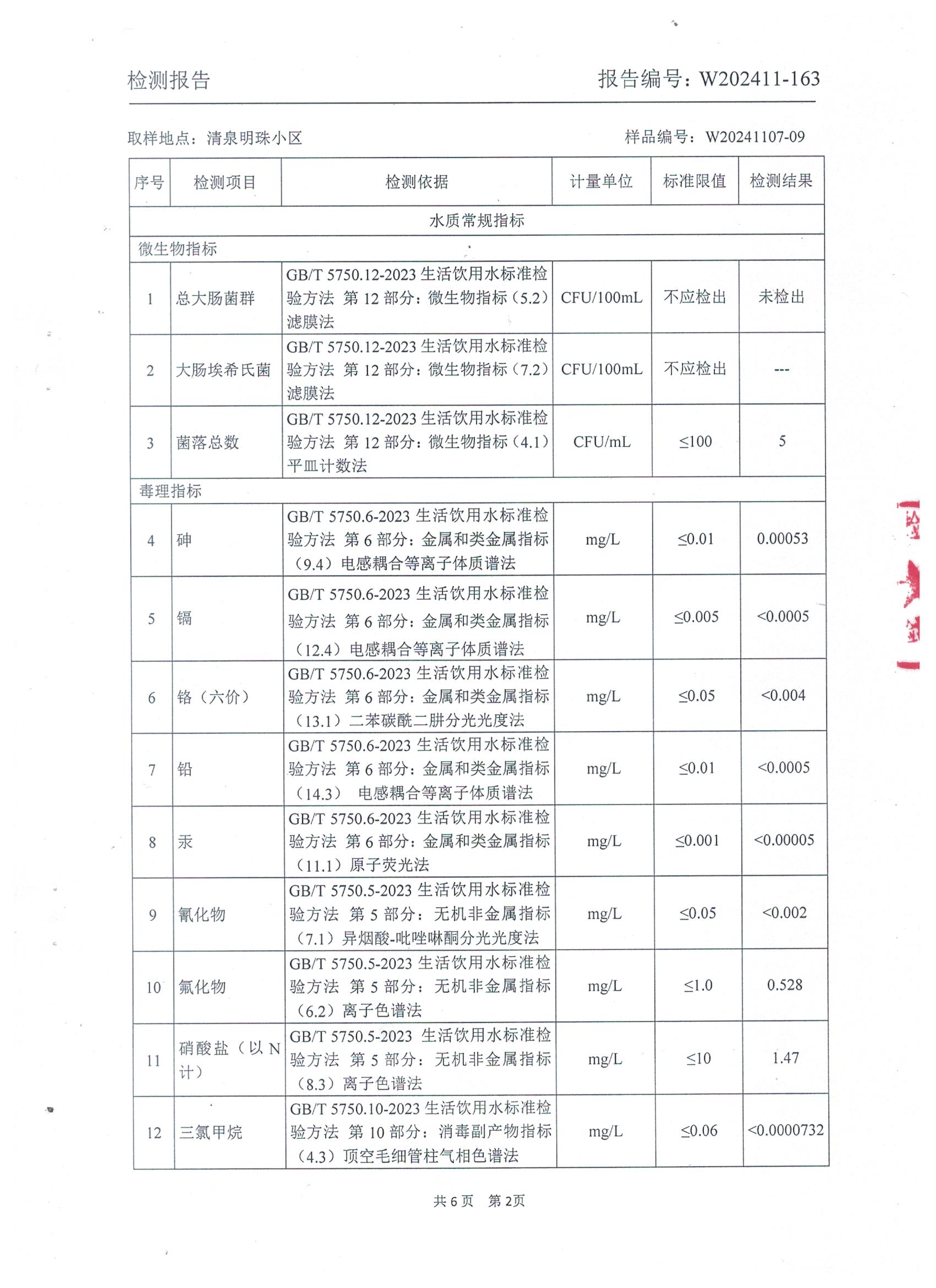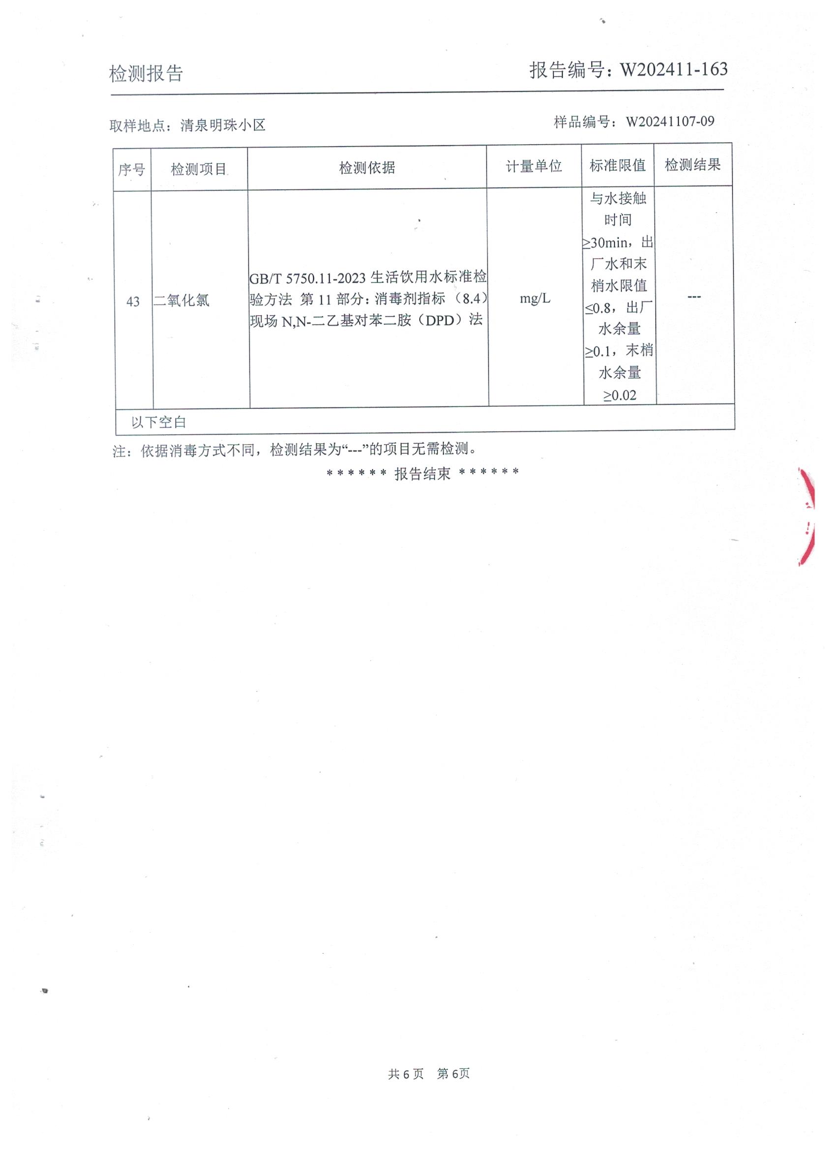 2024年11月管网水水质检测报告(清泉明珠小区)