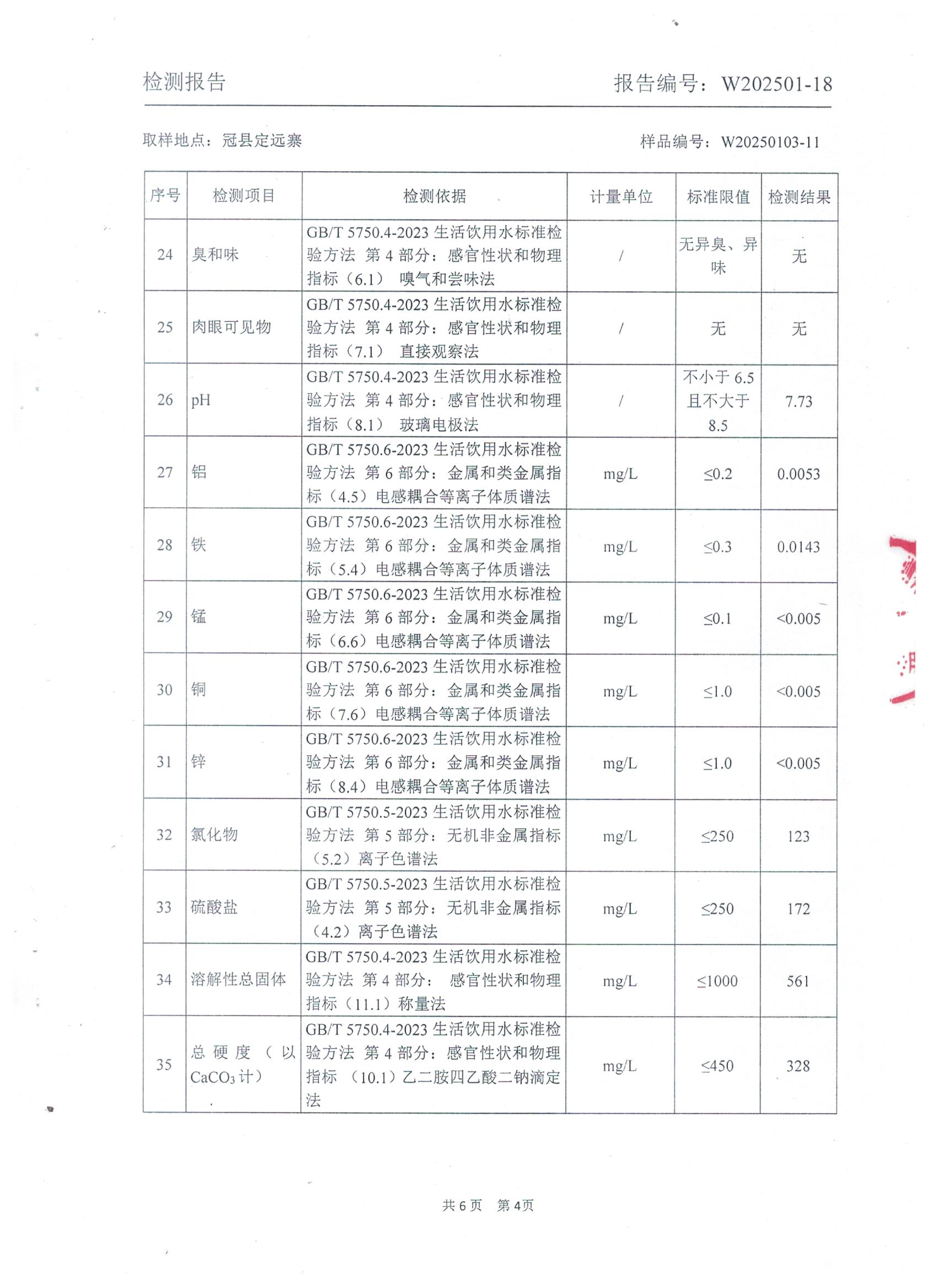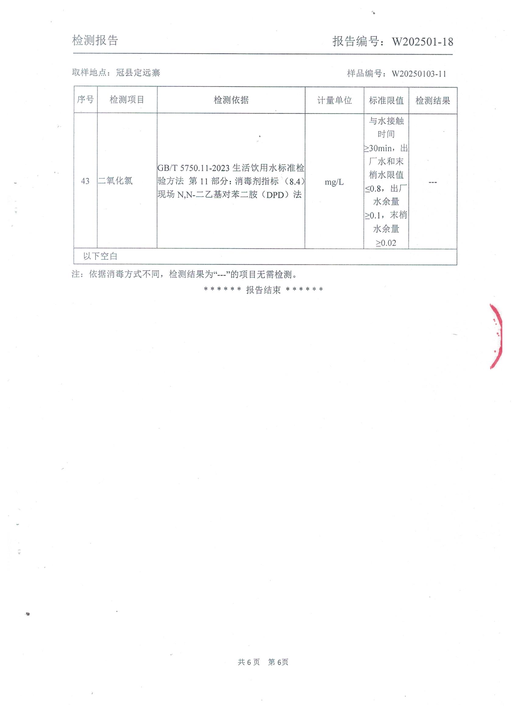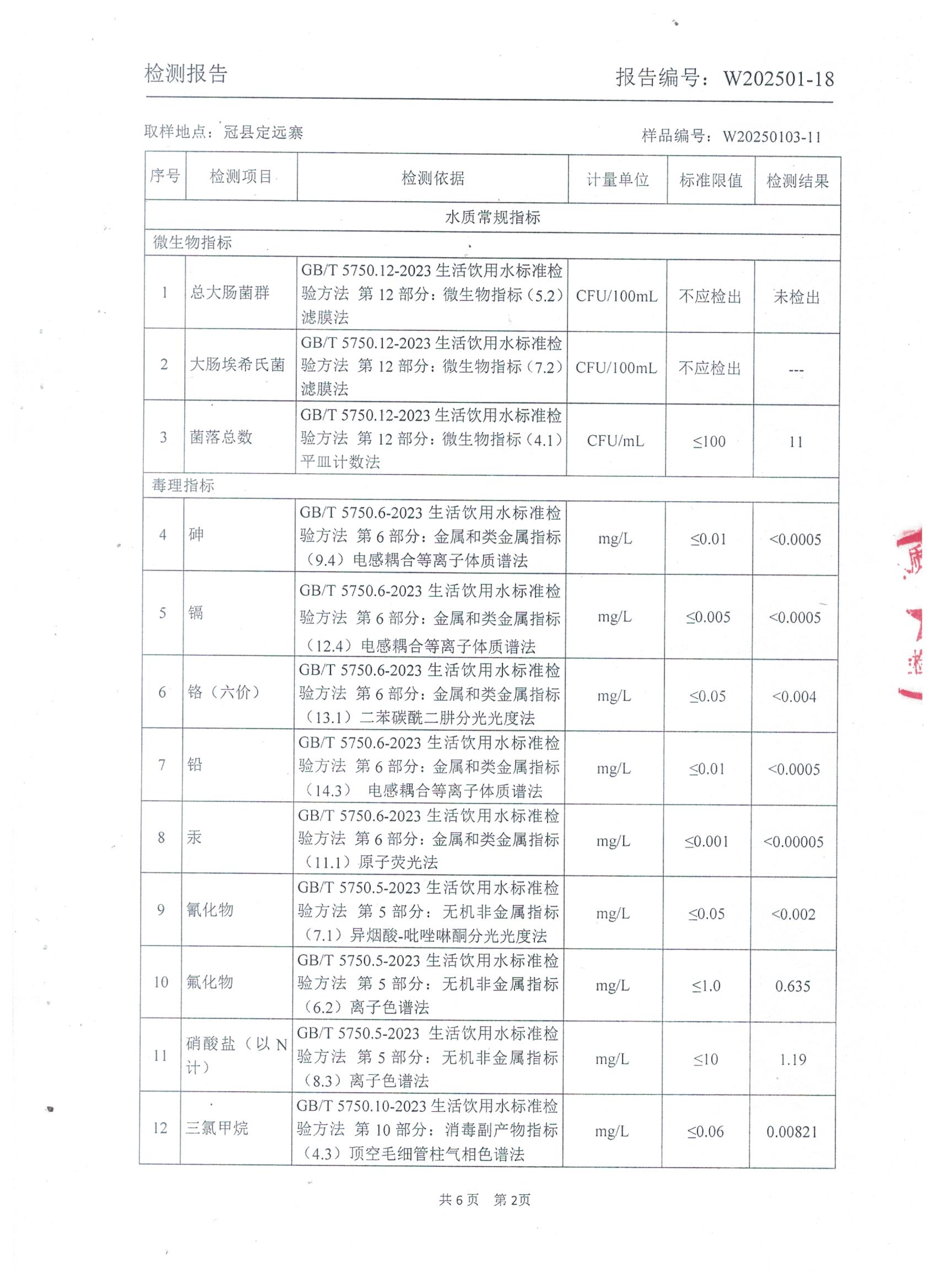 2025年1月管网水水质检测报告(定远寨)