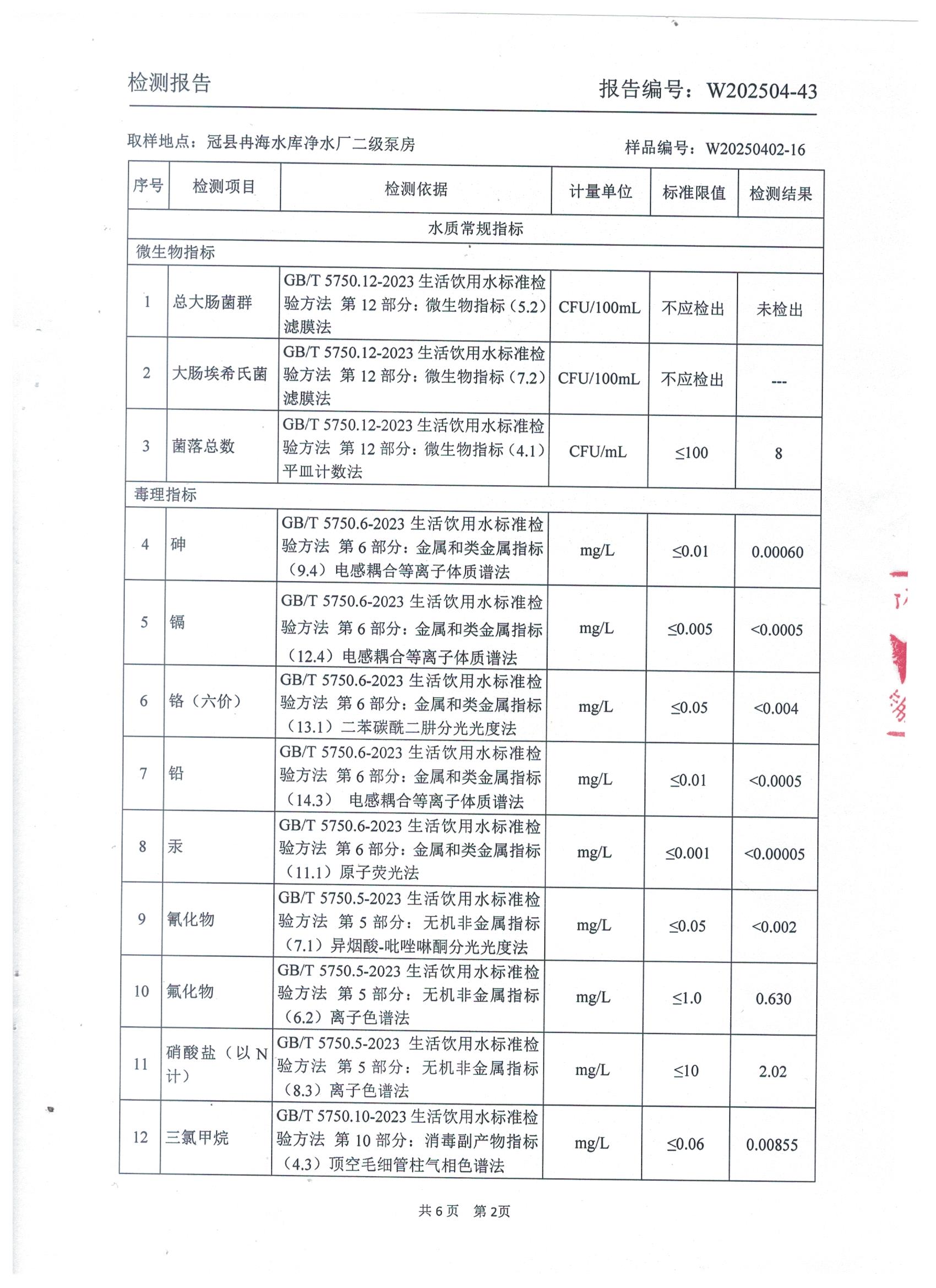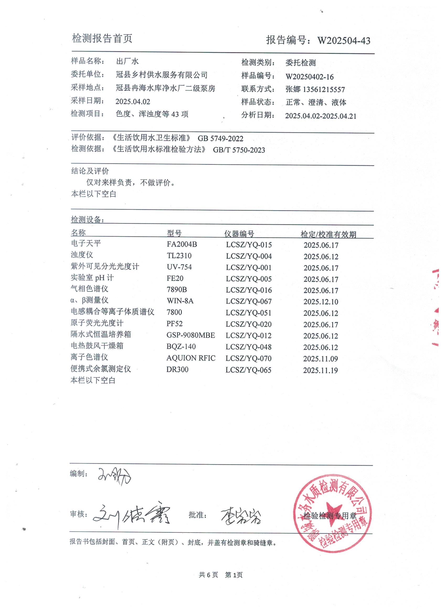 2025年4月出厂水水质检测报告