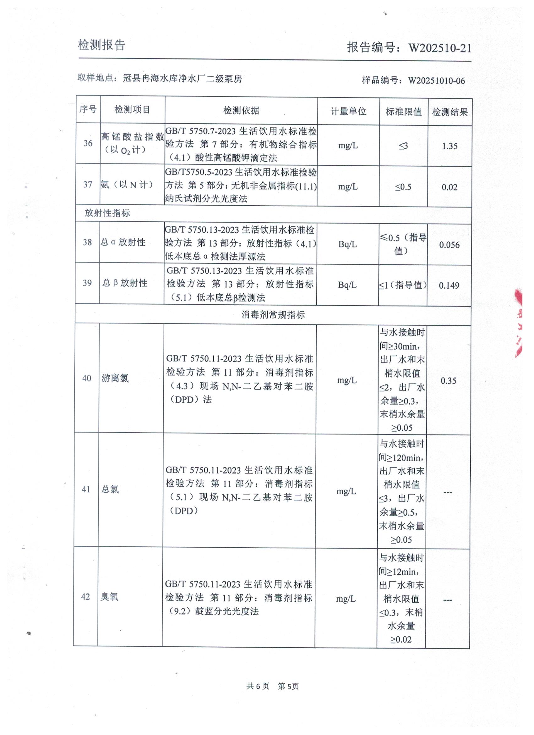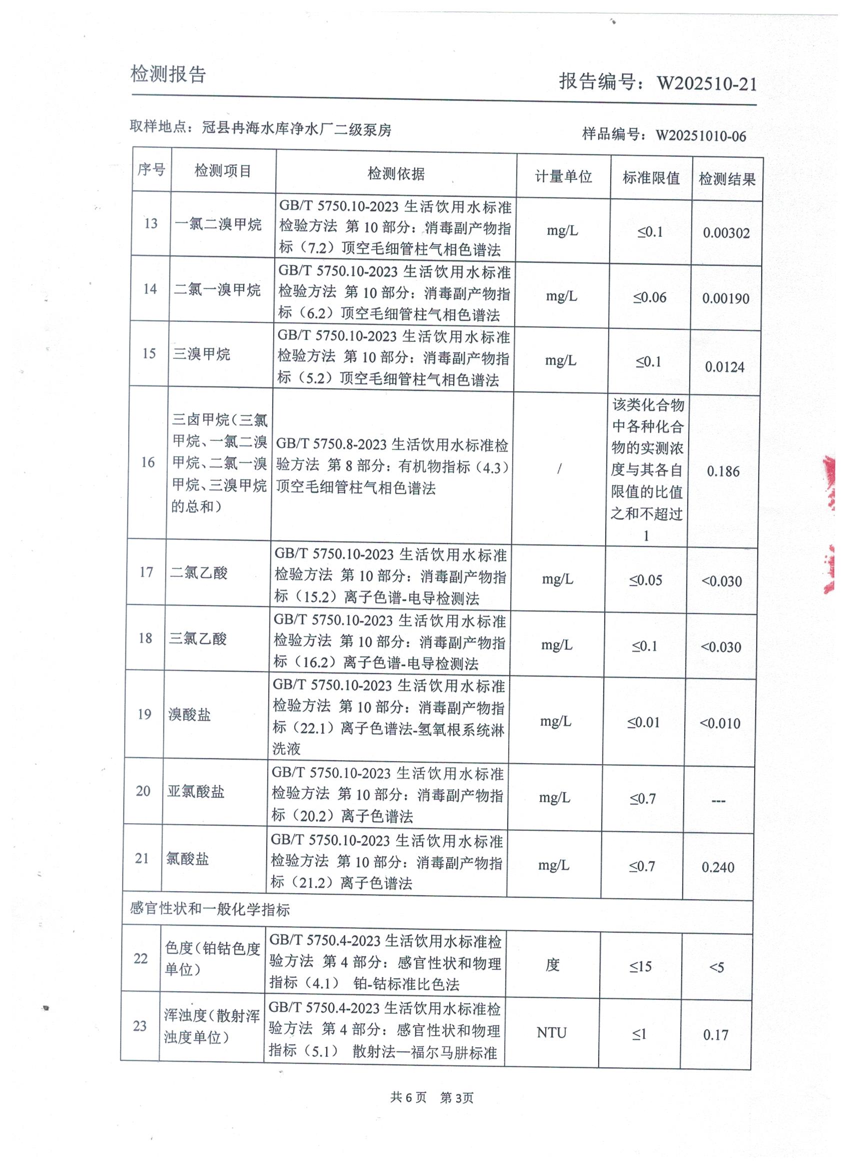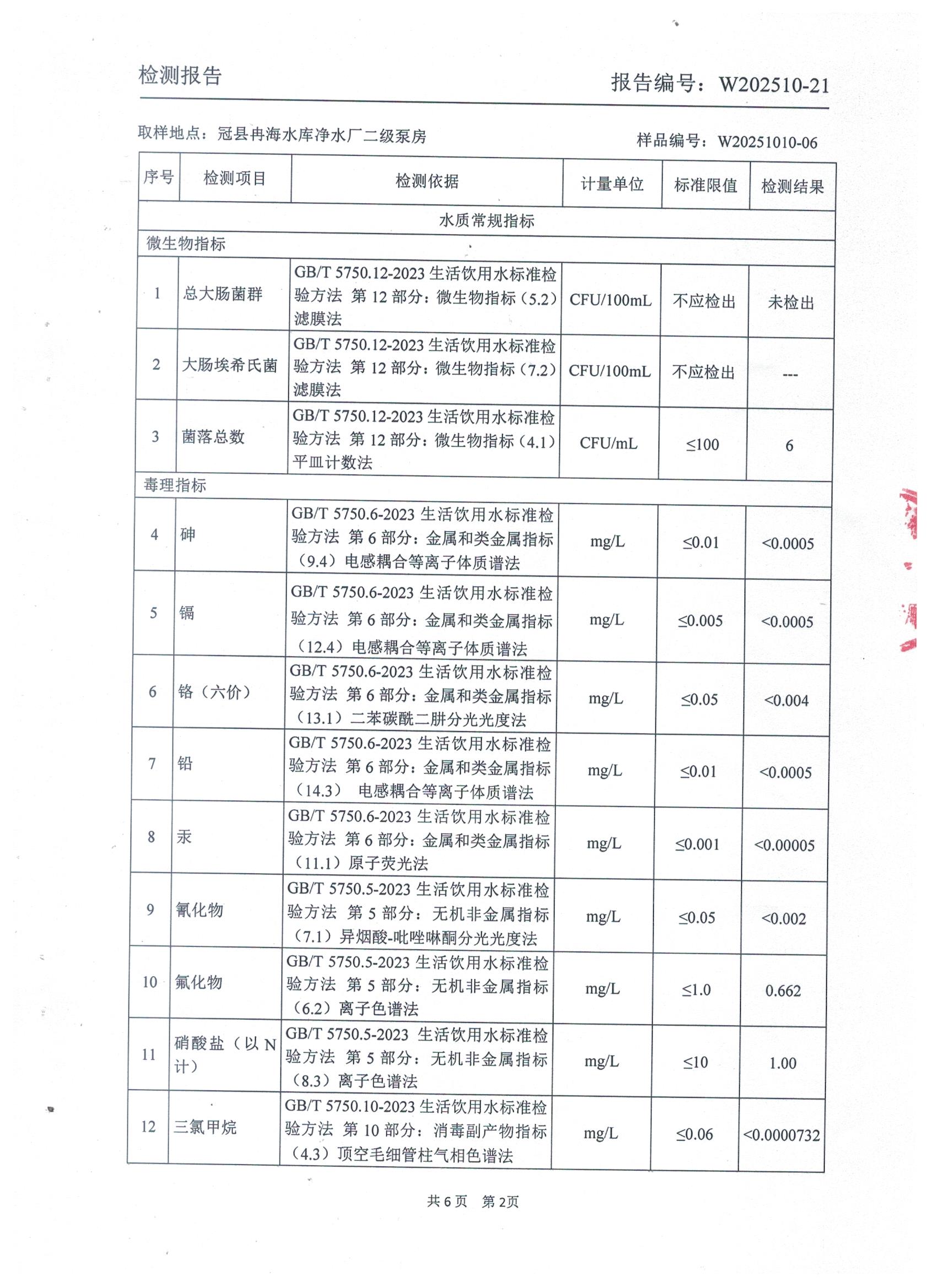 2025年10月出厂水水质检测报告