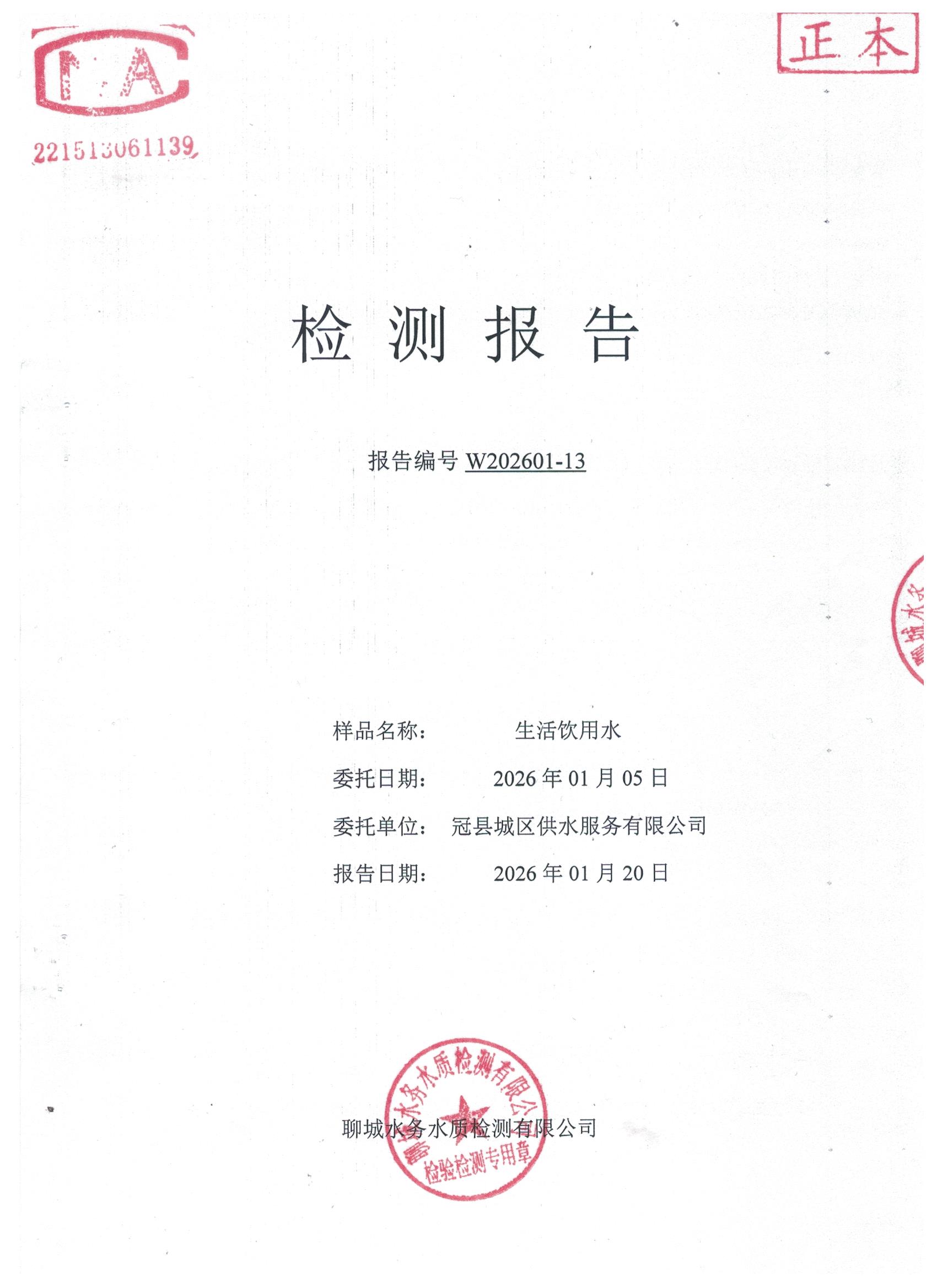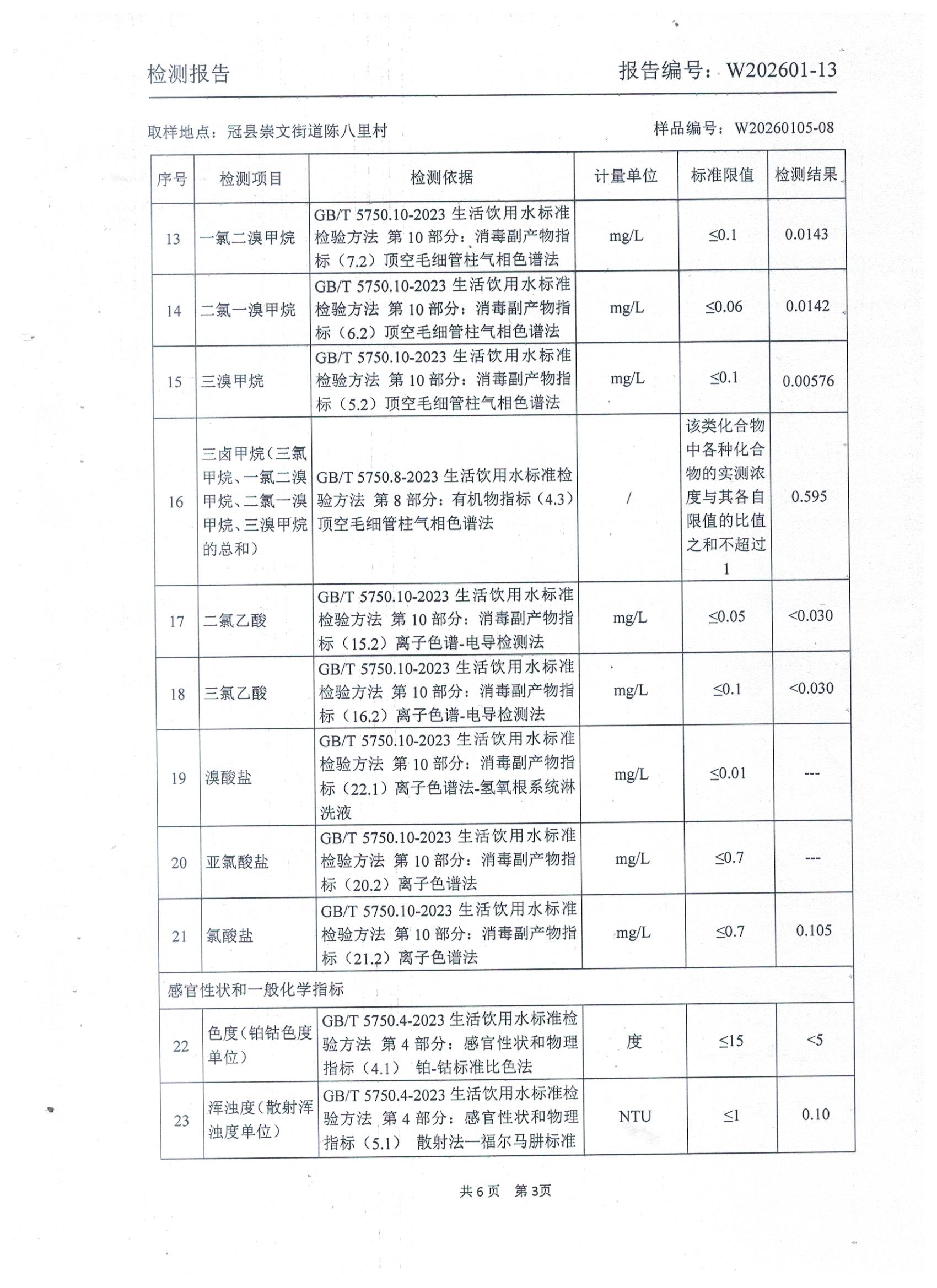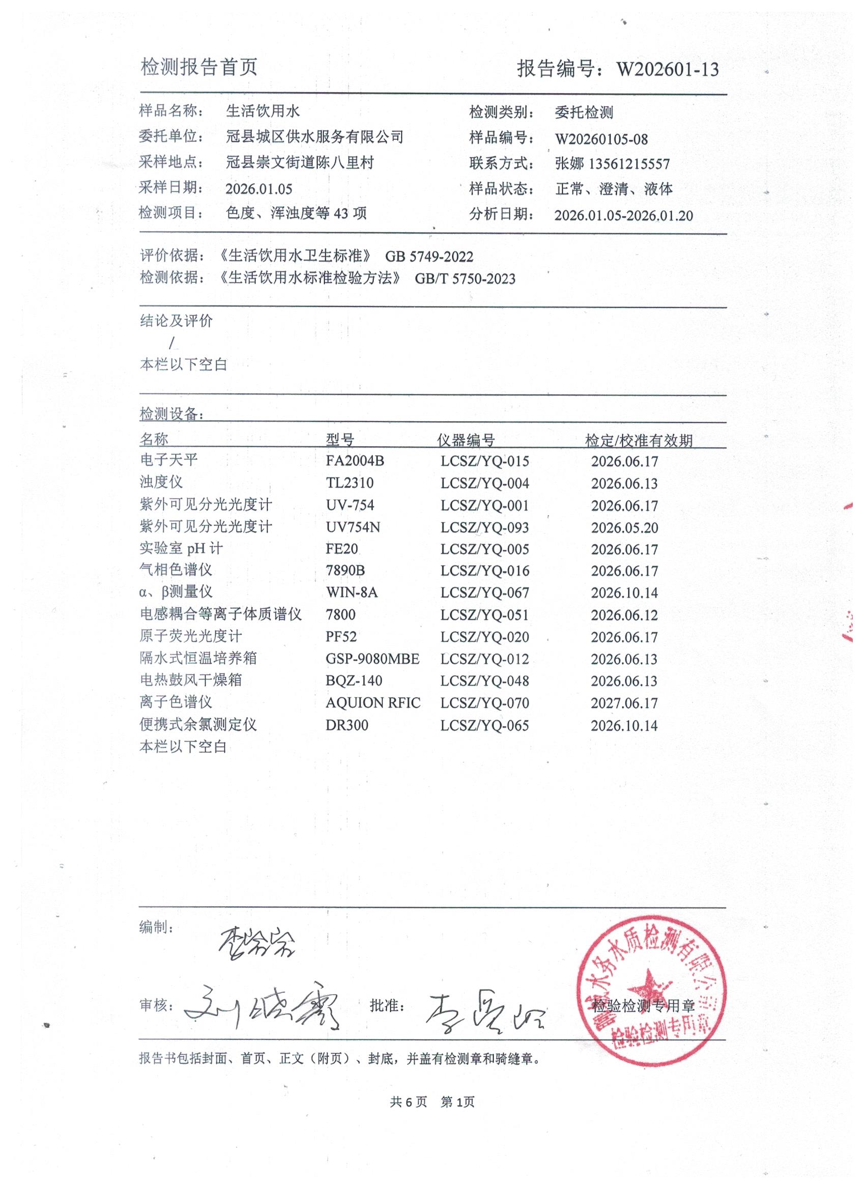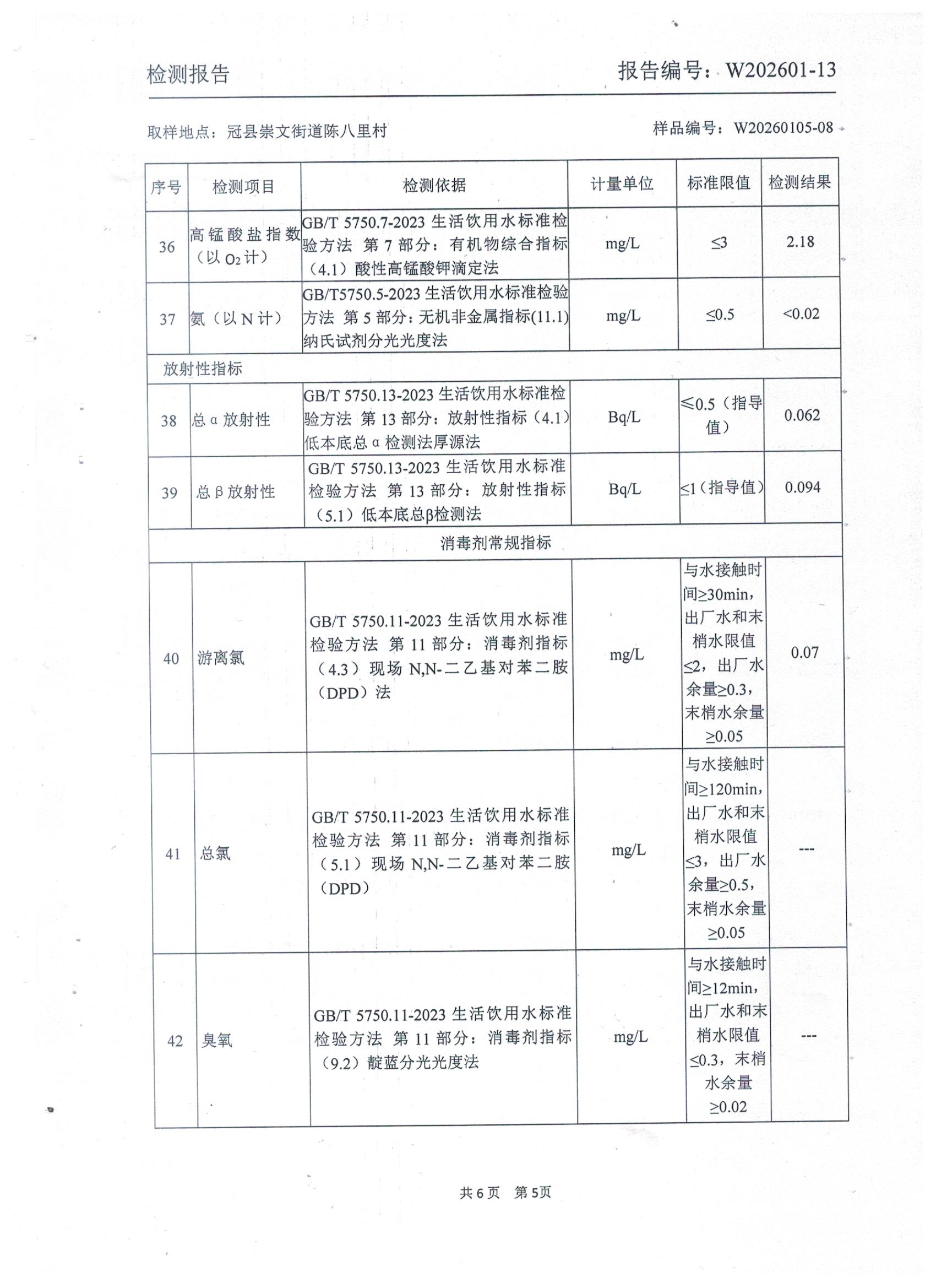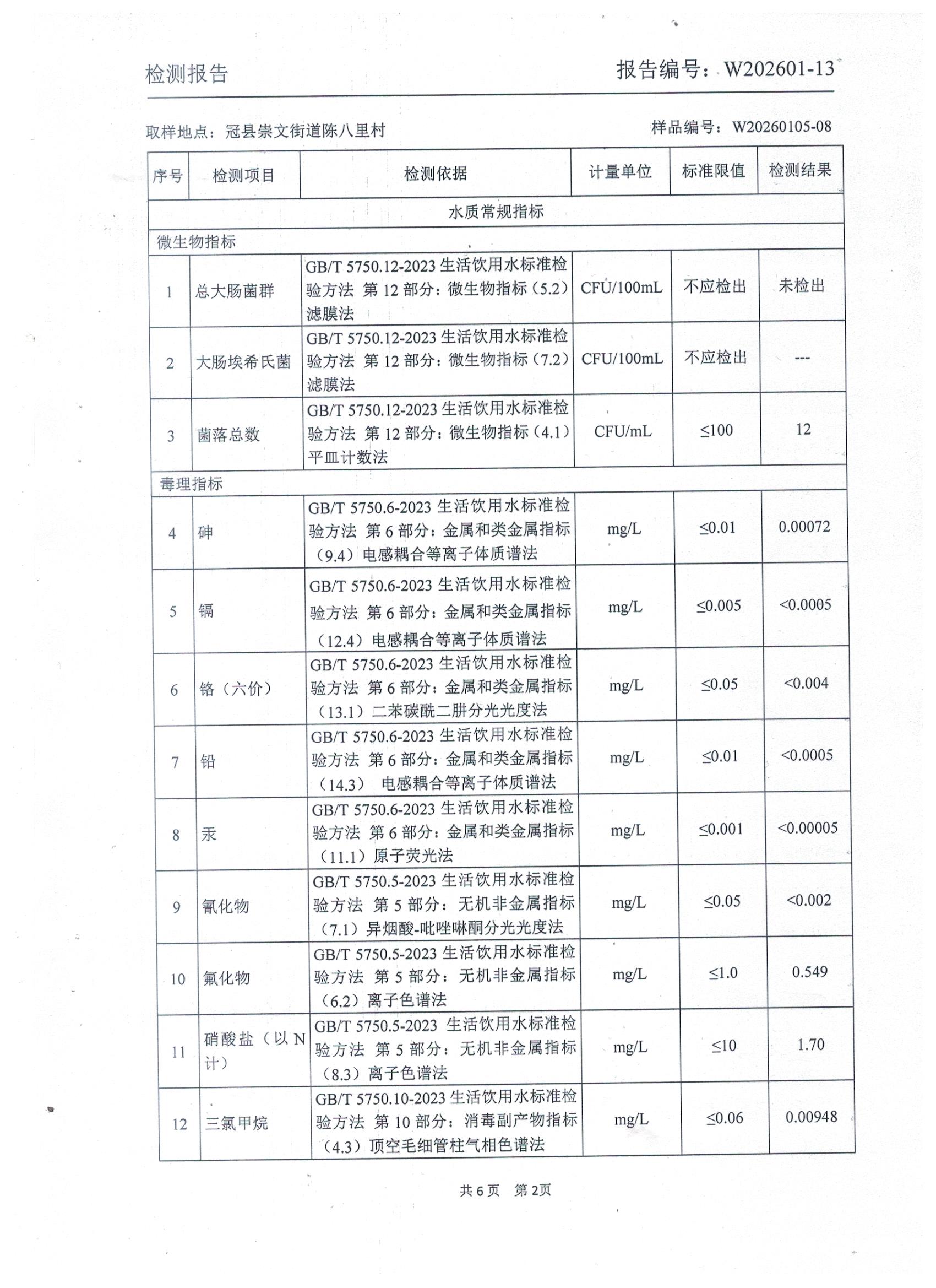 2026年1月管网水水质检测报告(崇文街道陈八里村)