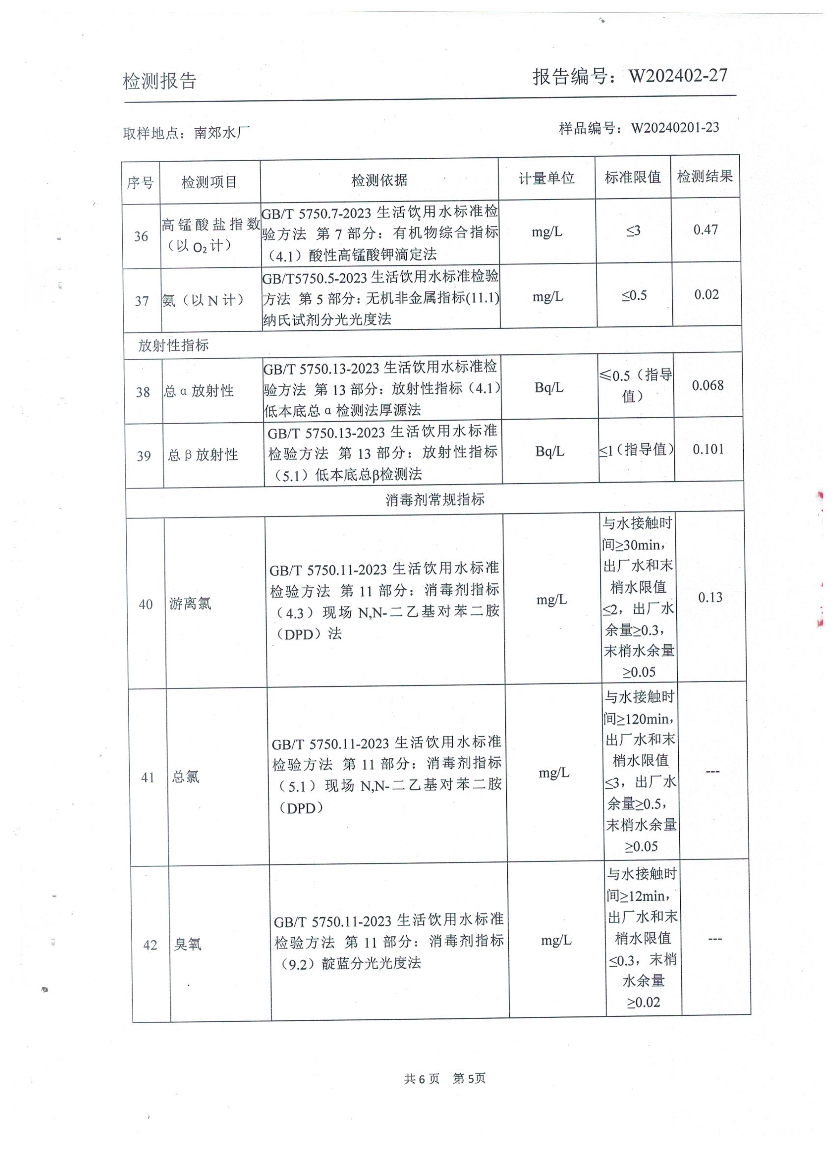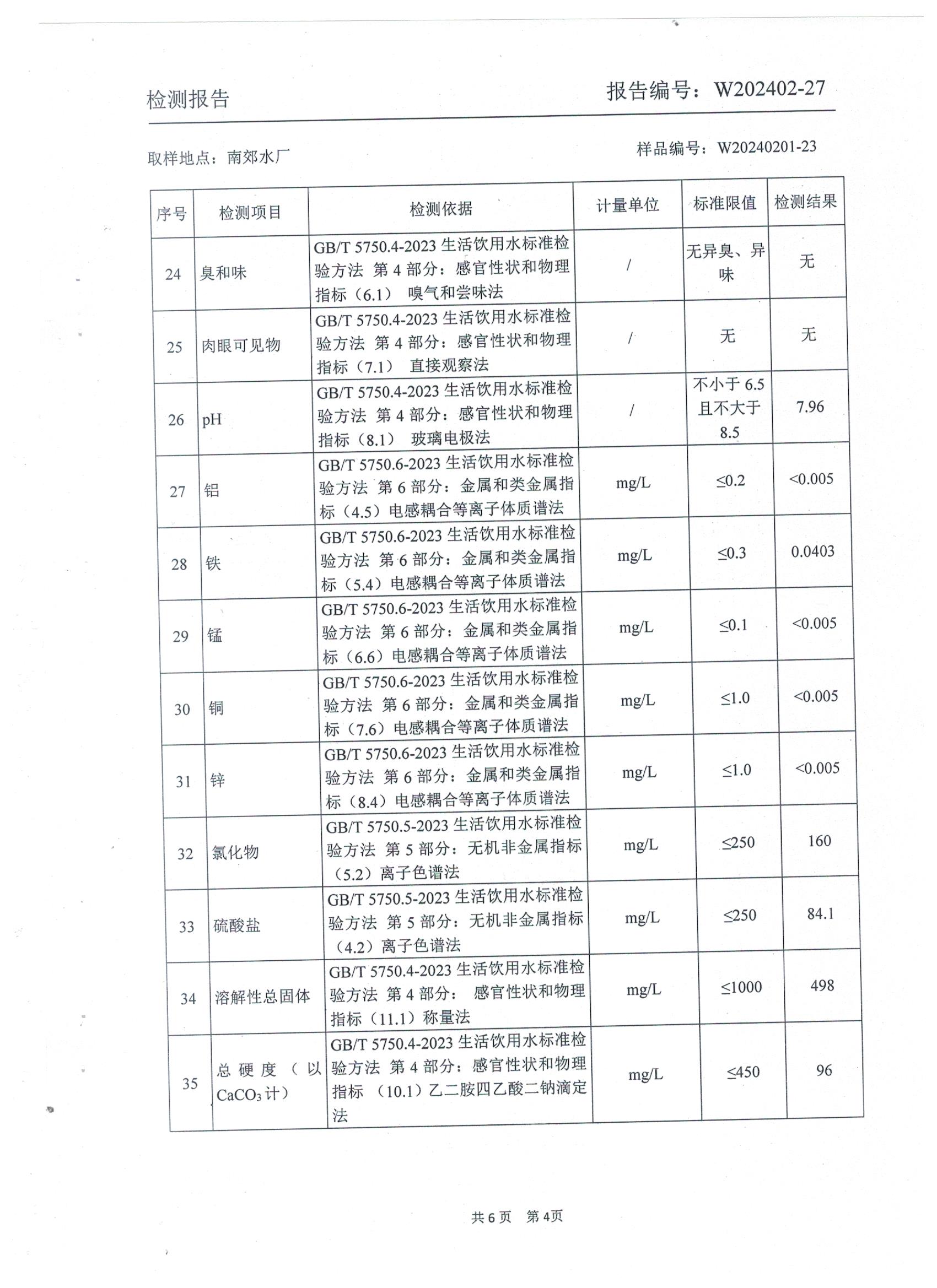 2024年2月城区出厂水水质检测报告