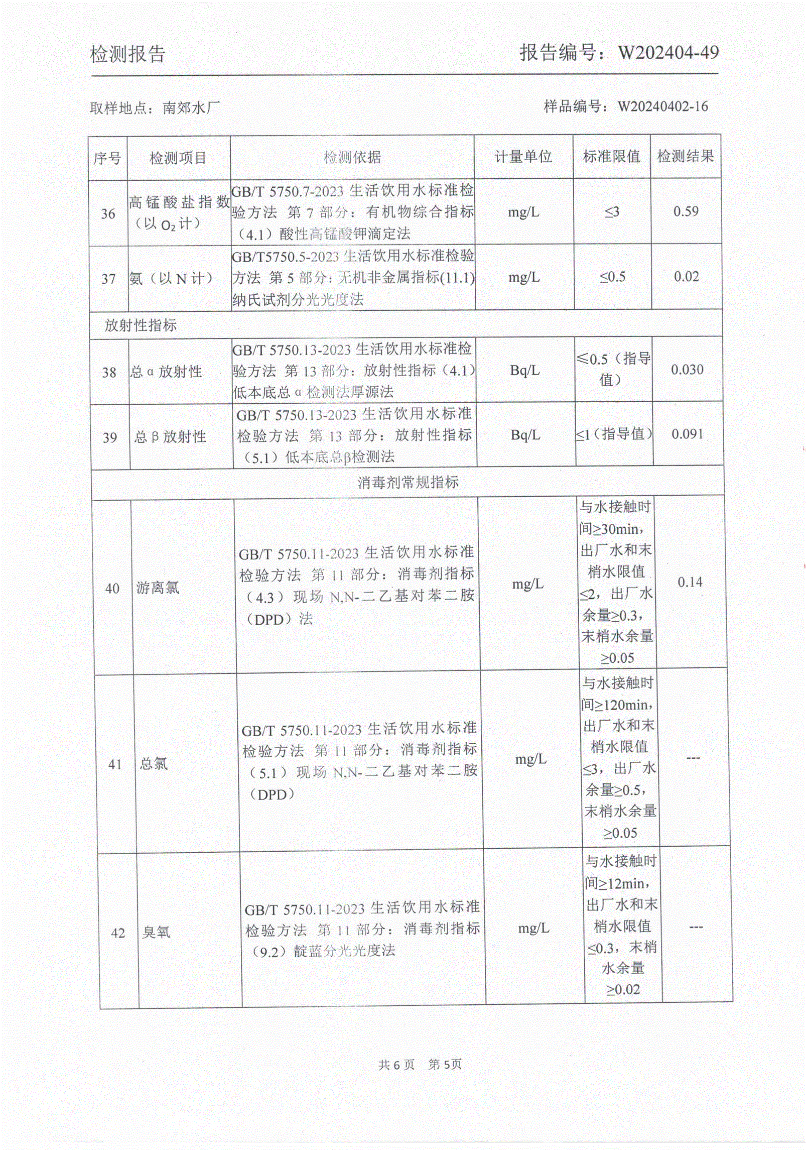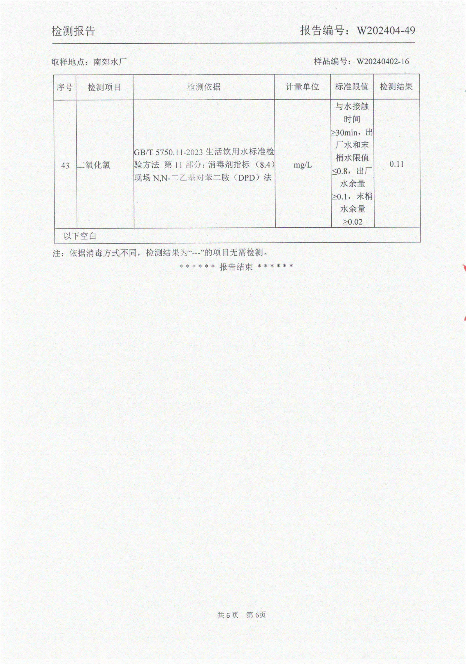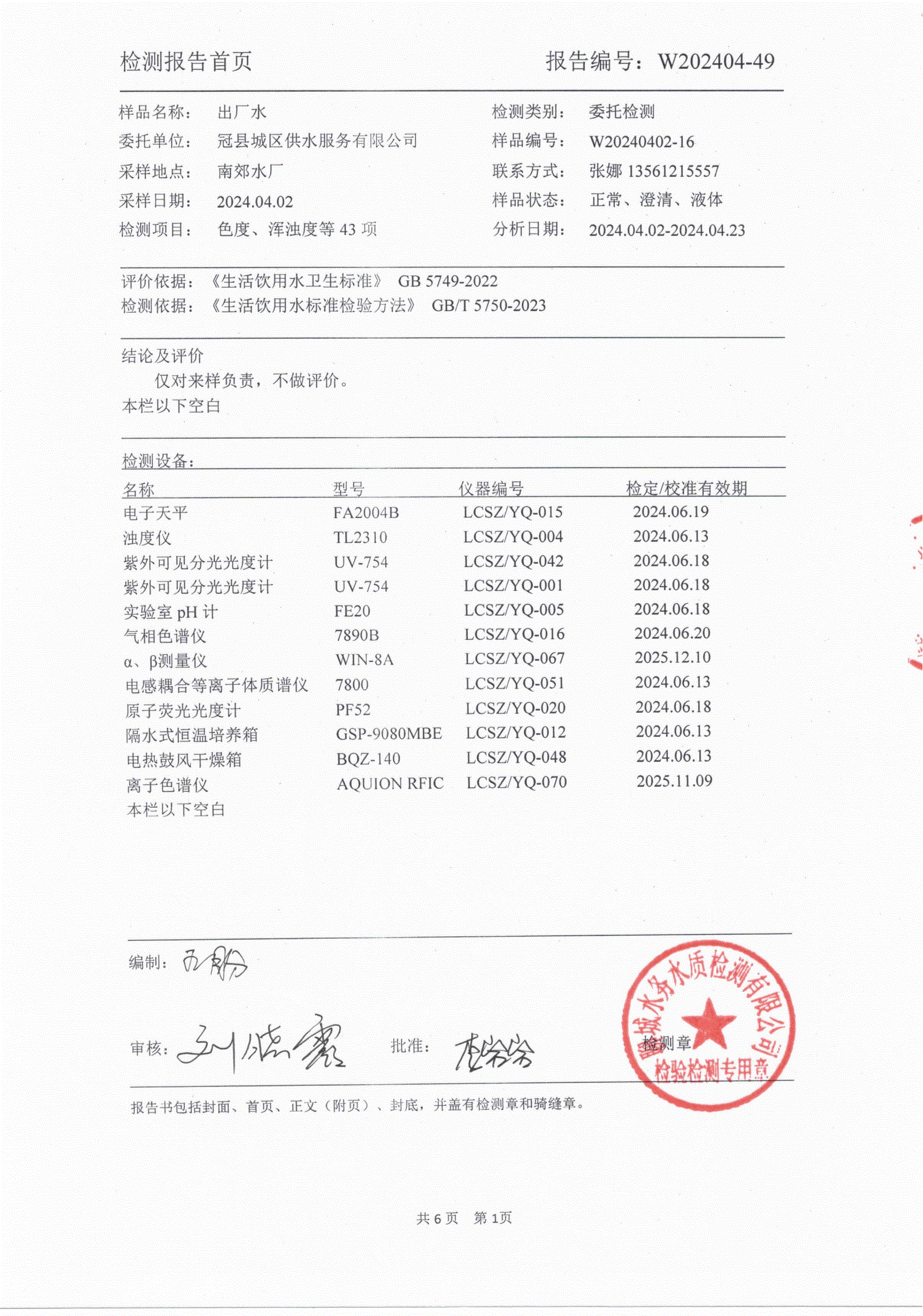 2024年4月城区出厂水水质检测报告