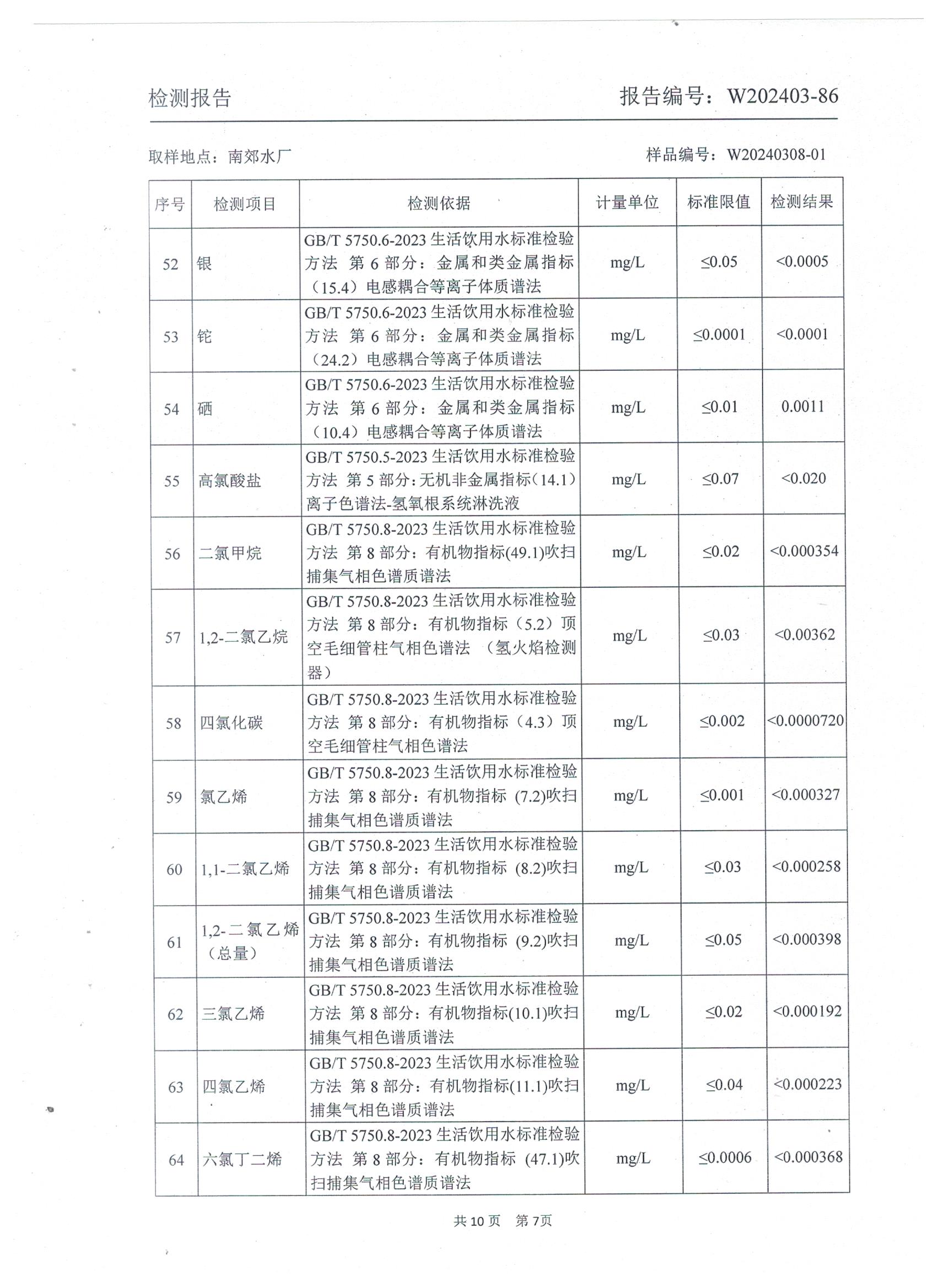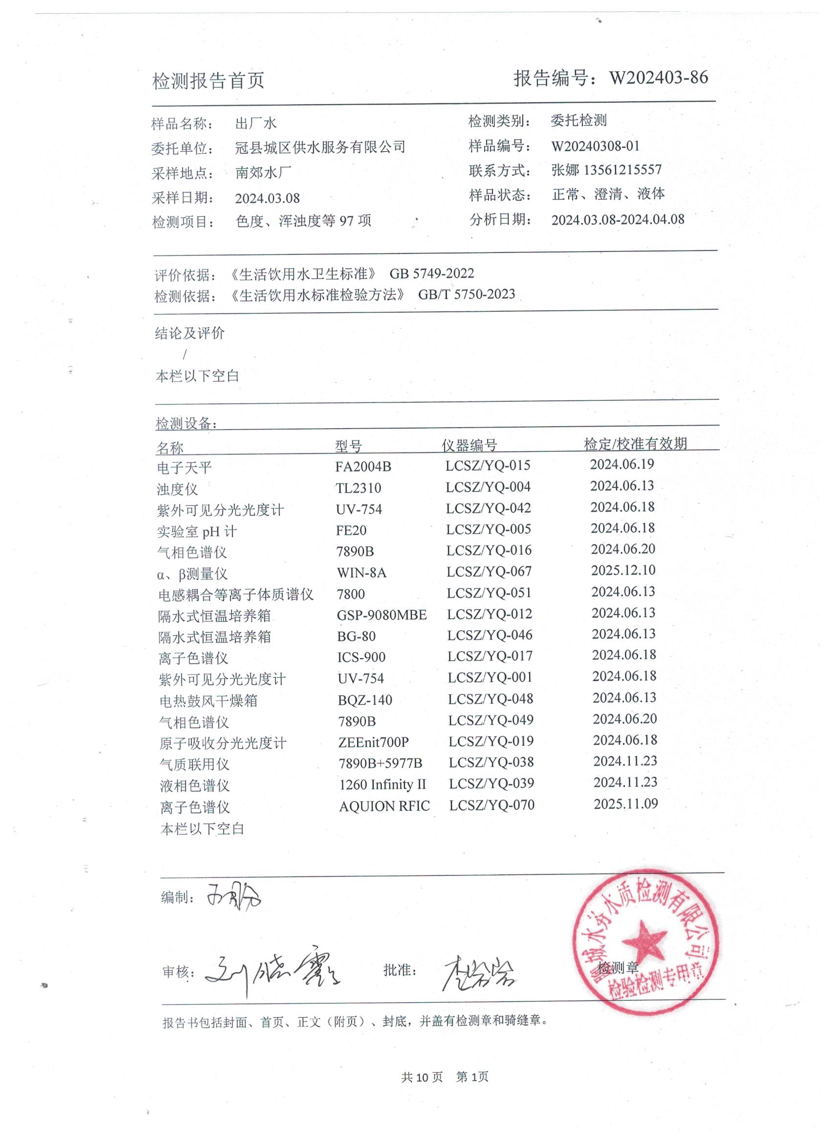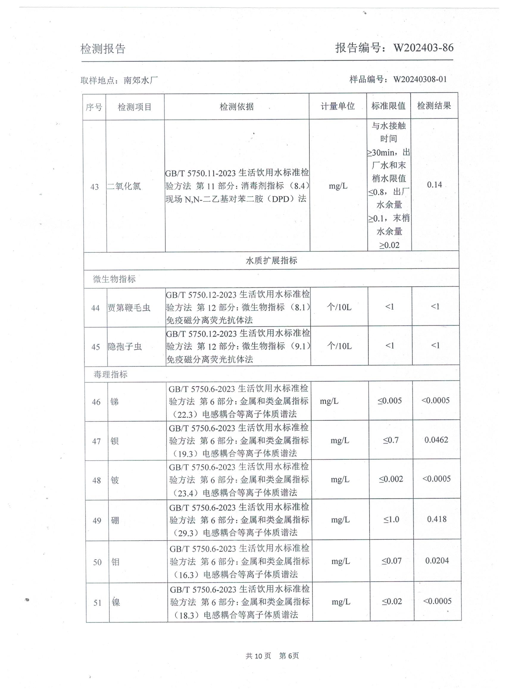 2024年城区出厂水年检水质检测报告