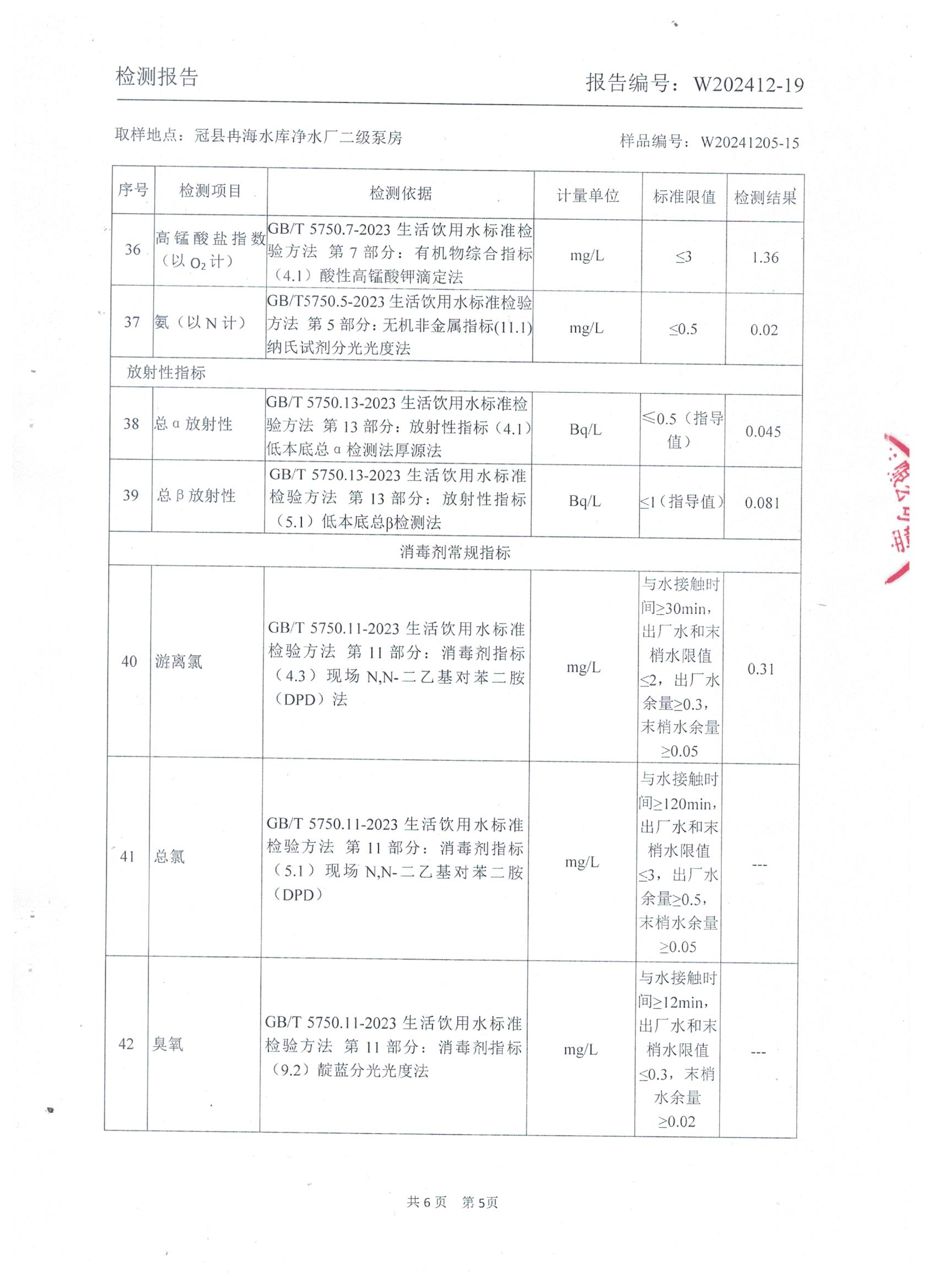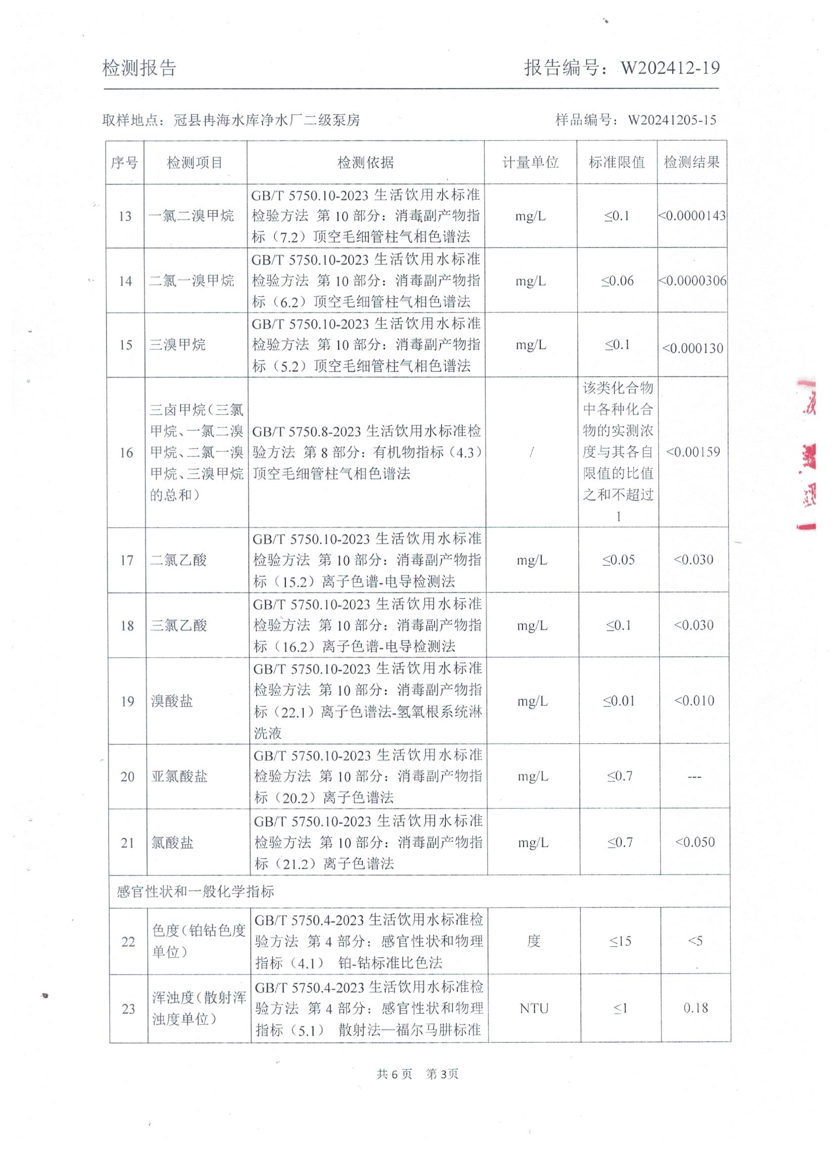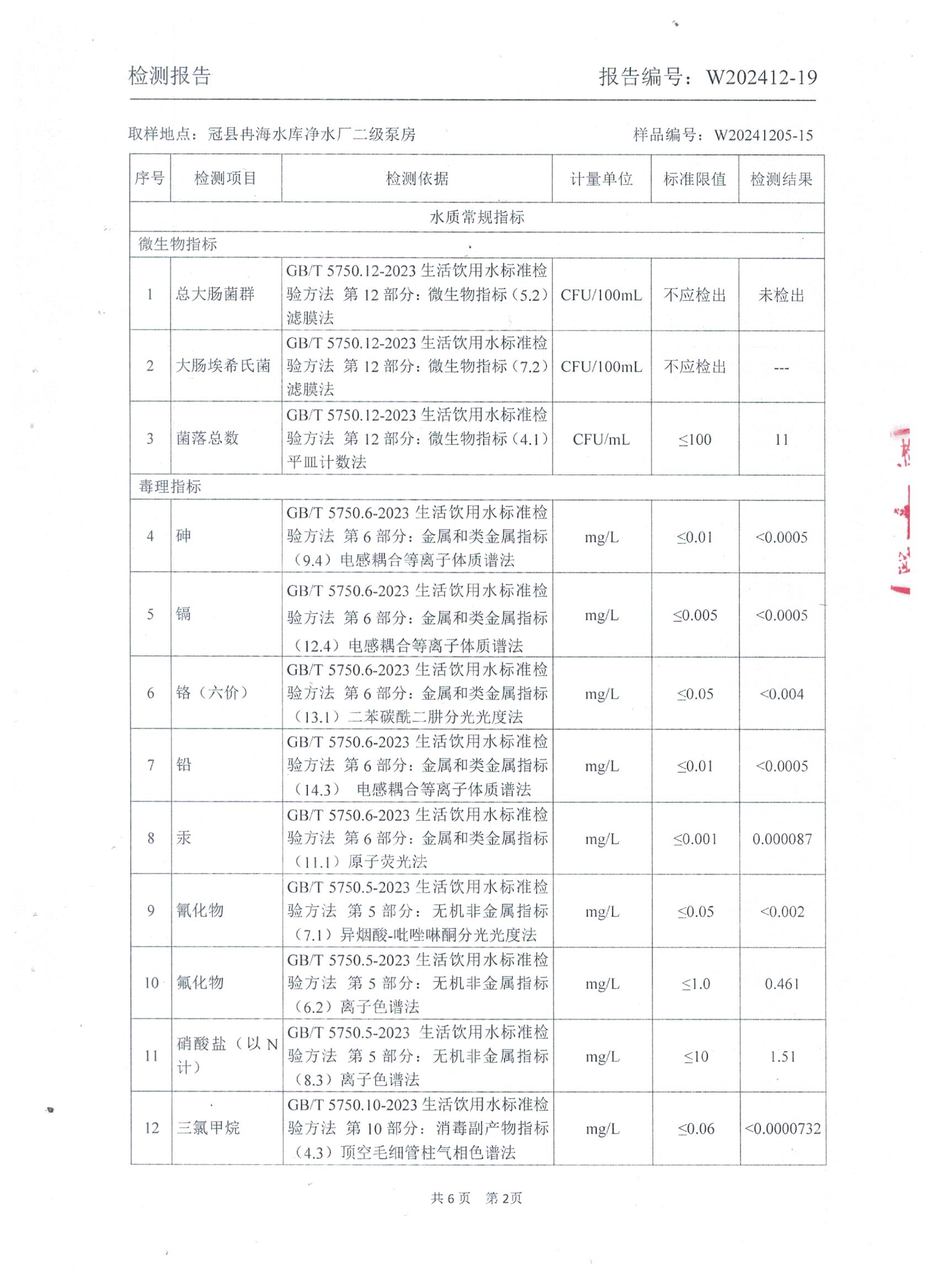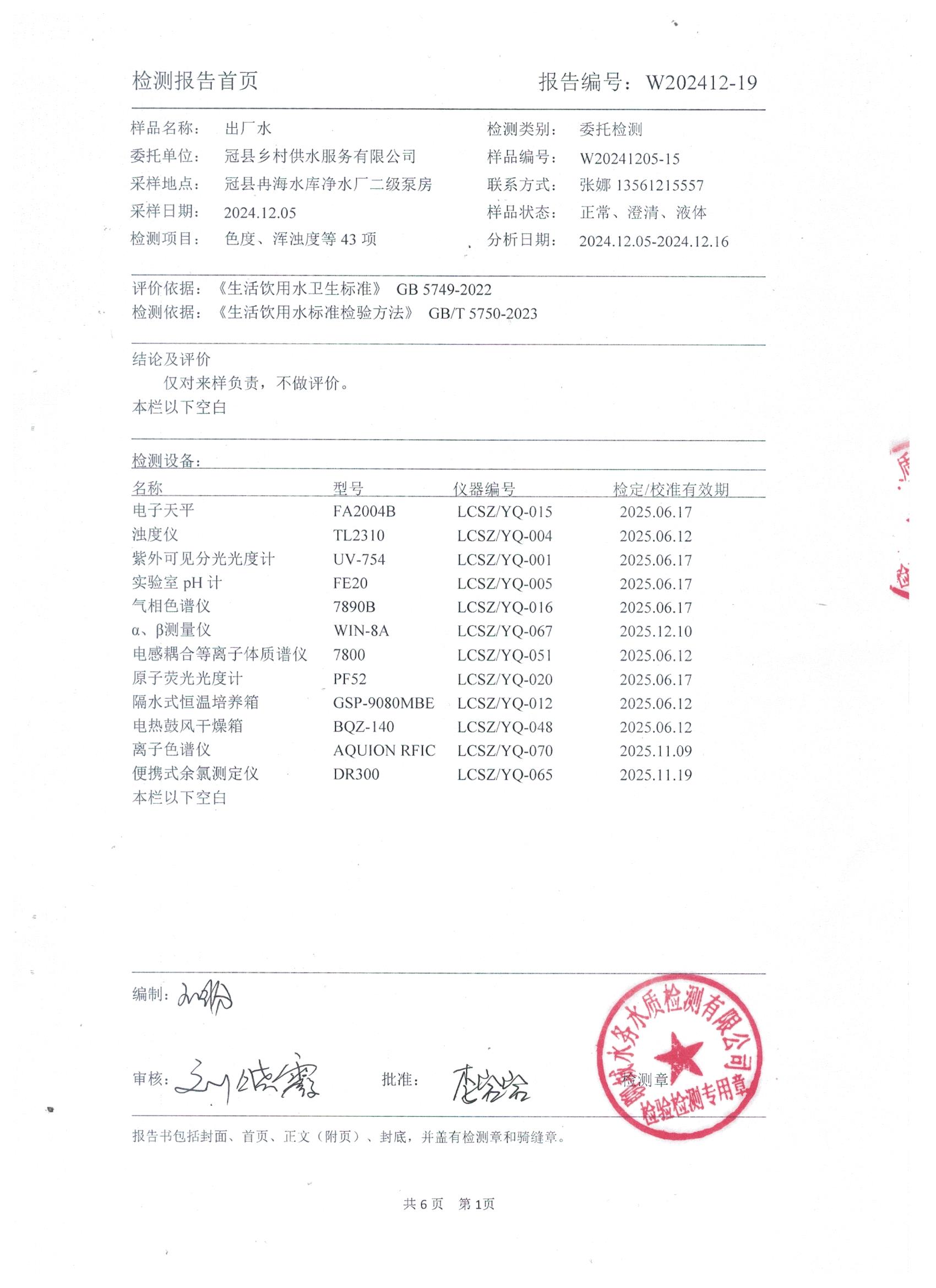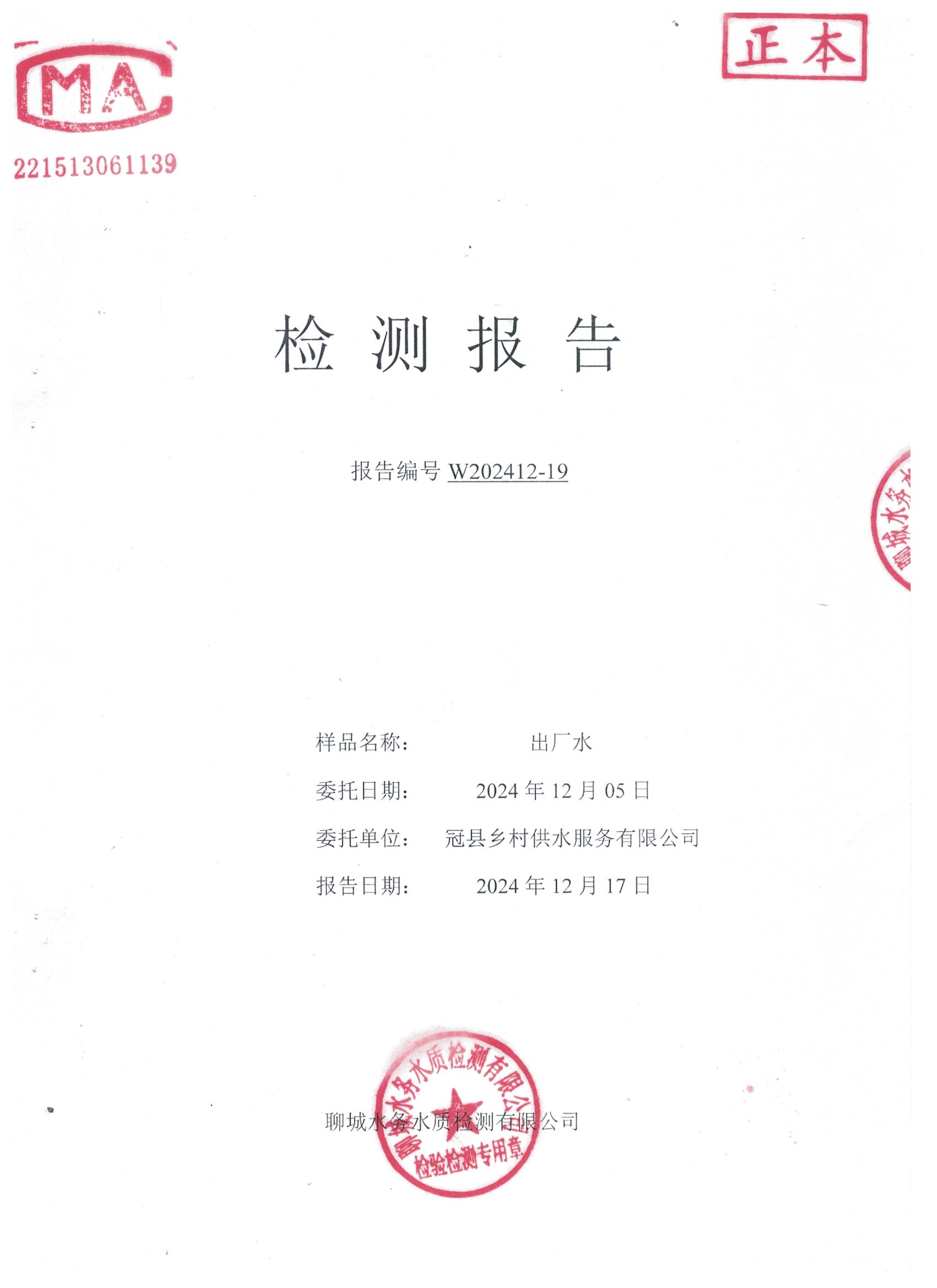 2024年12月出厂水水质检测报告