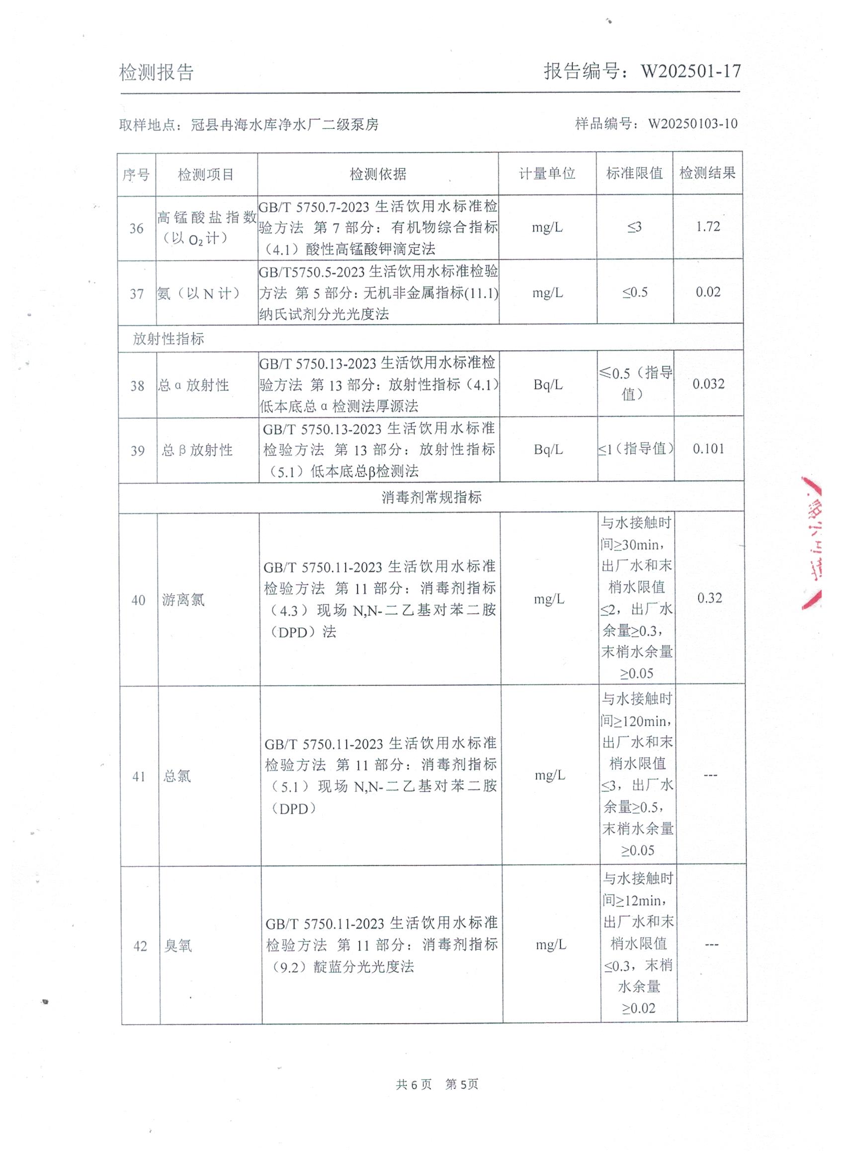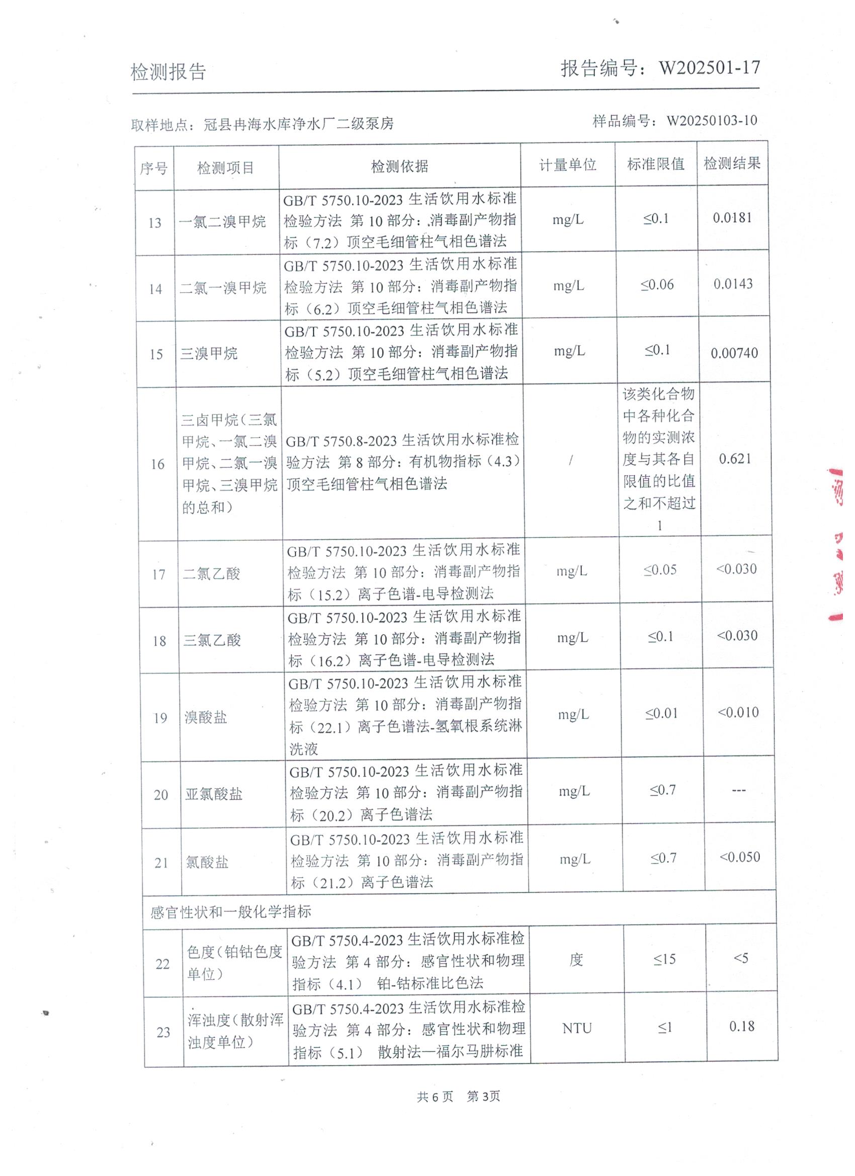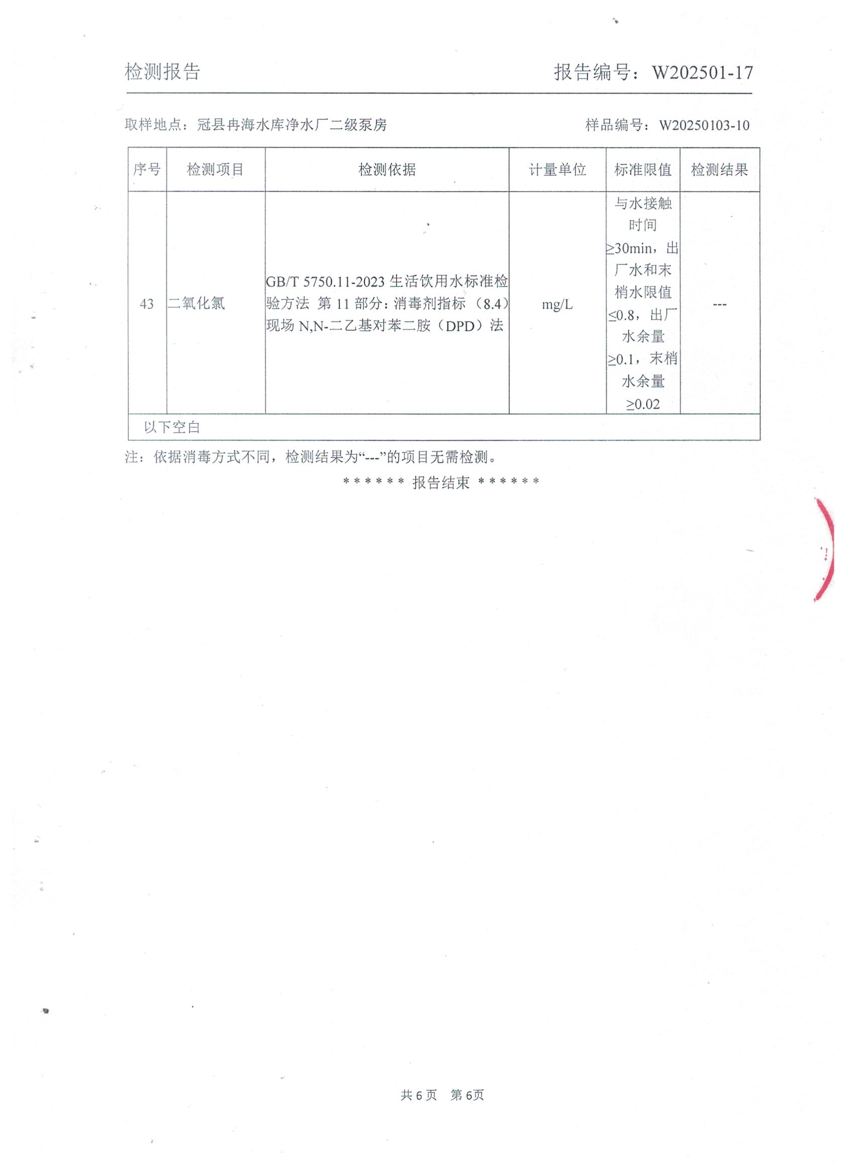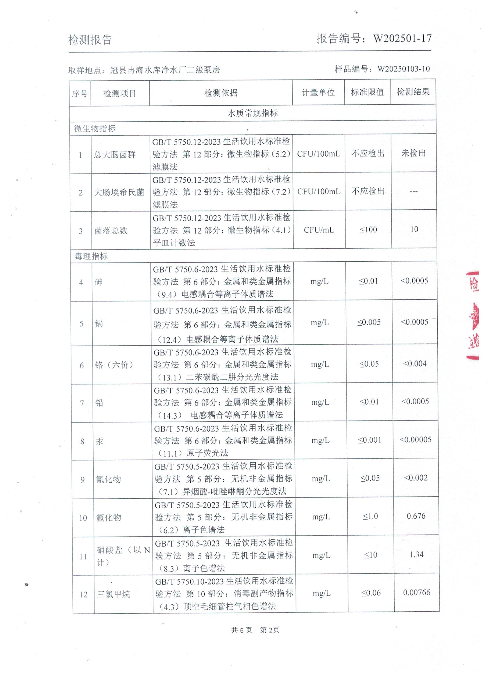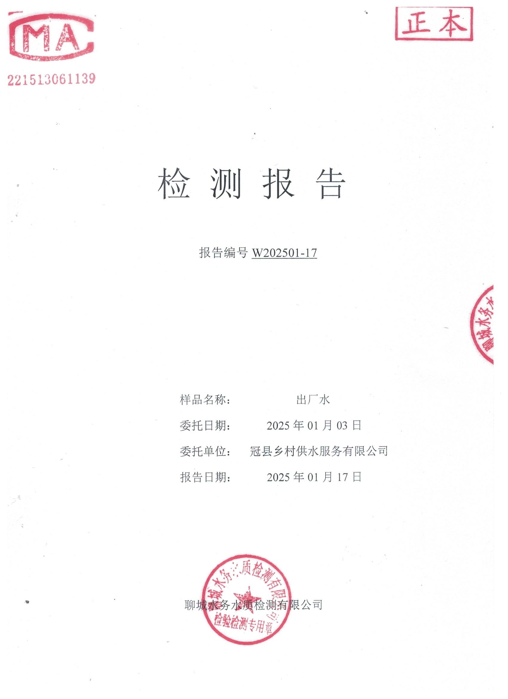 2025年1月出厂水水质检测报告