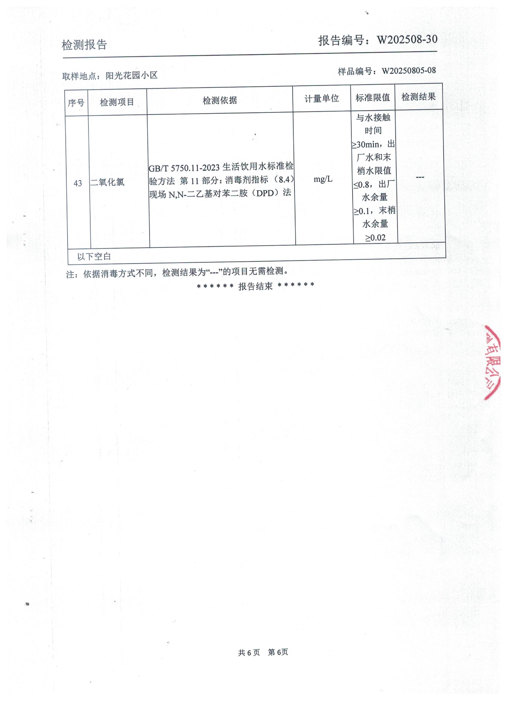 2025年8月管网水水质检测报告(阳光花园小区)
