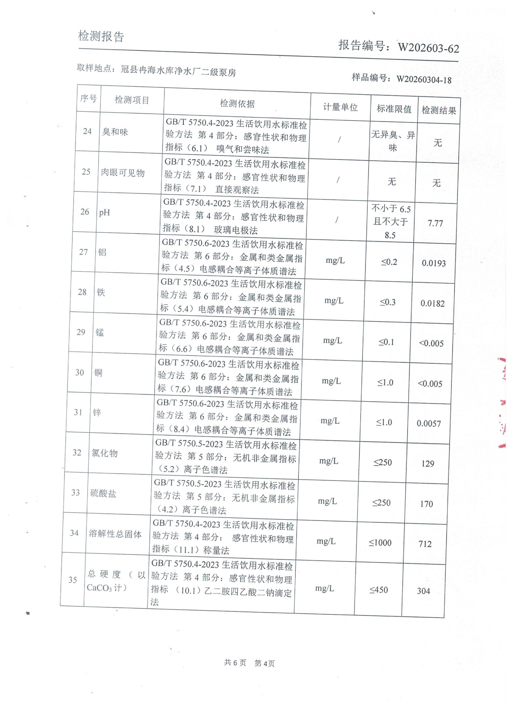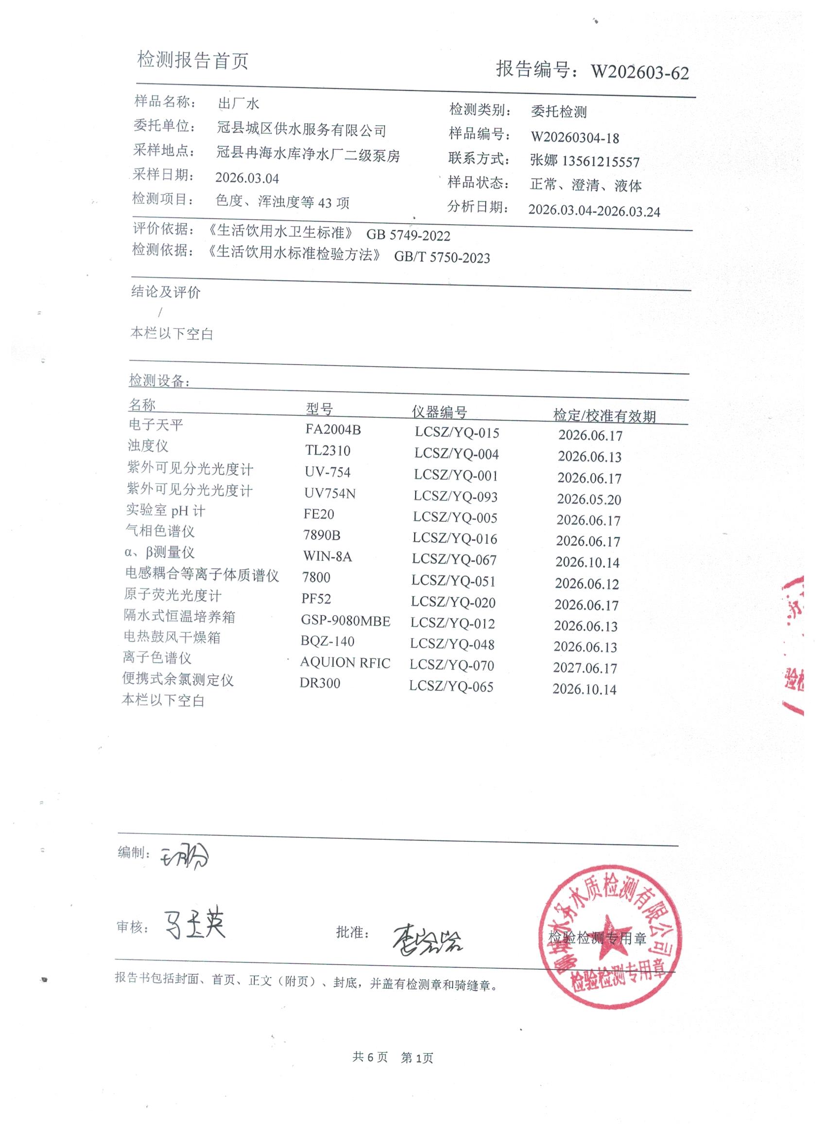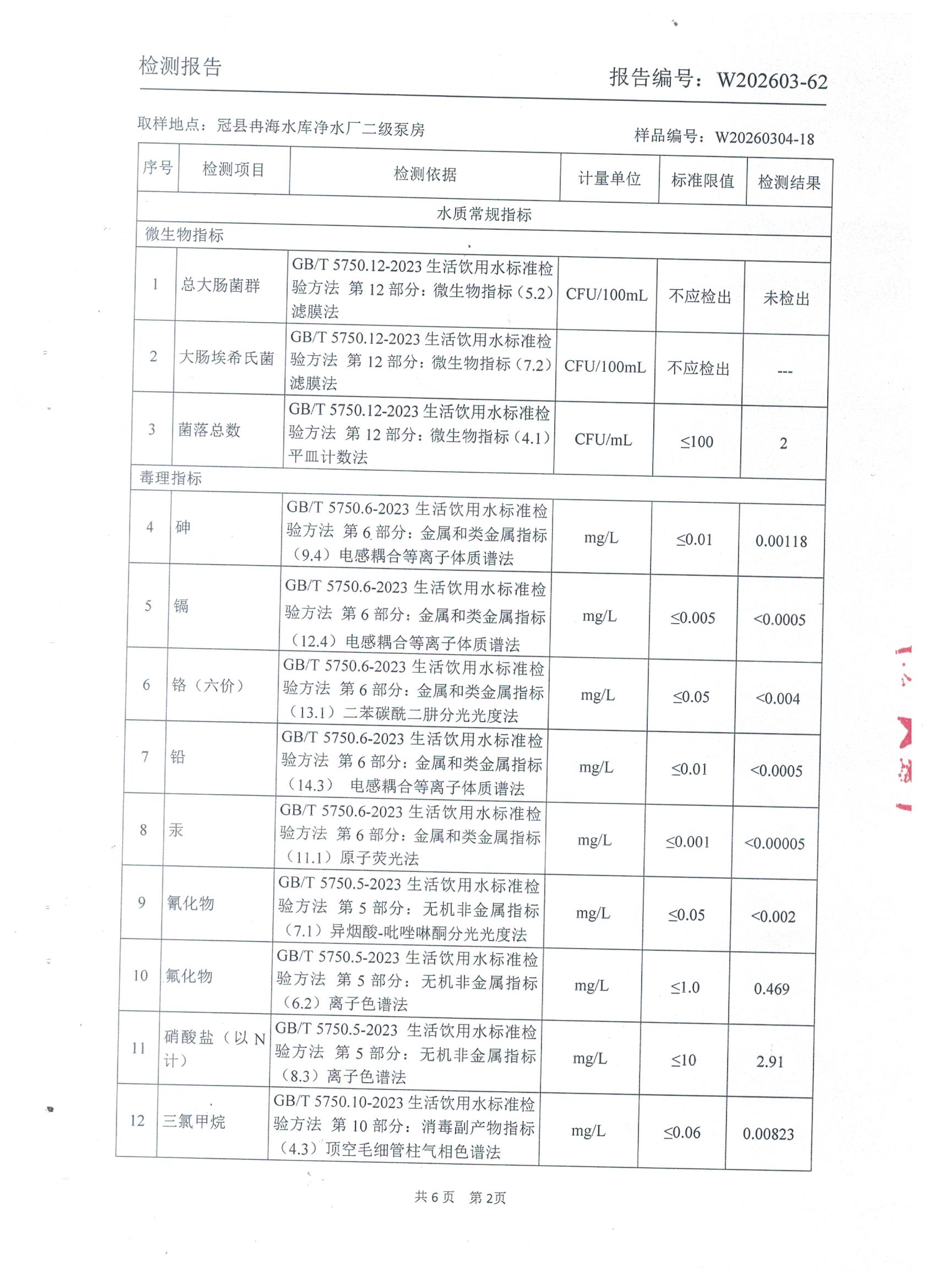 2026年3月份出厂水水质检测报告